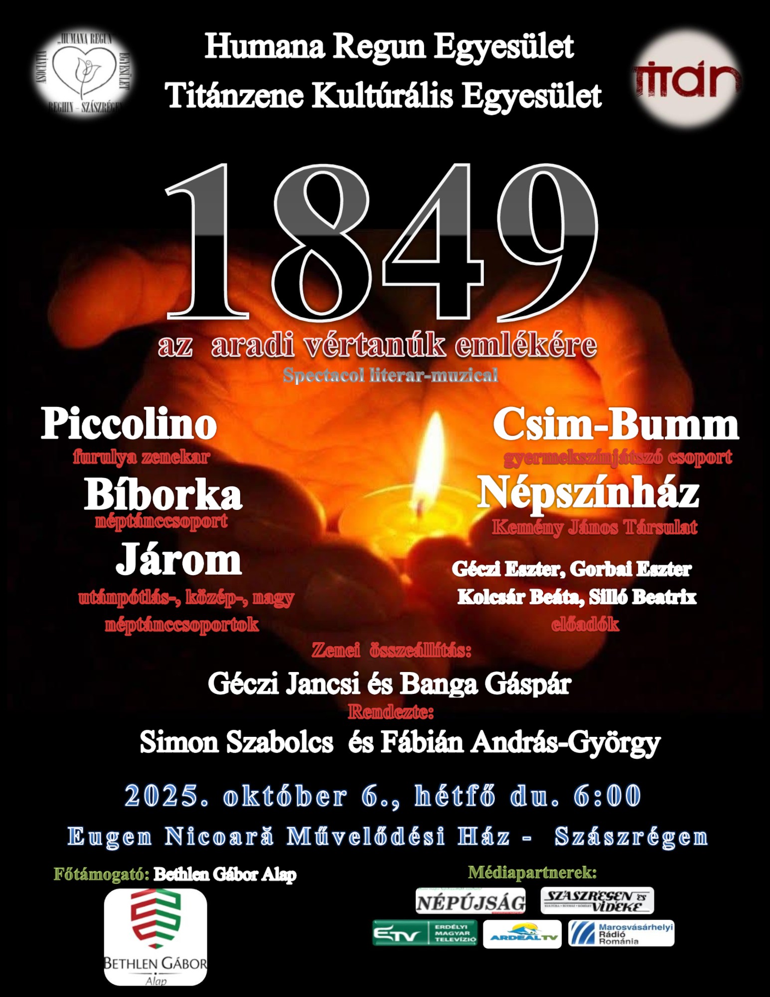 Az aradi vértanúk emlékére 1849 címmel szervez előadást Szászrégenben a Humana Regun Egyesület és a Titánzene Kulturális Egyesület.