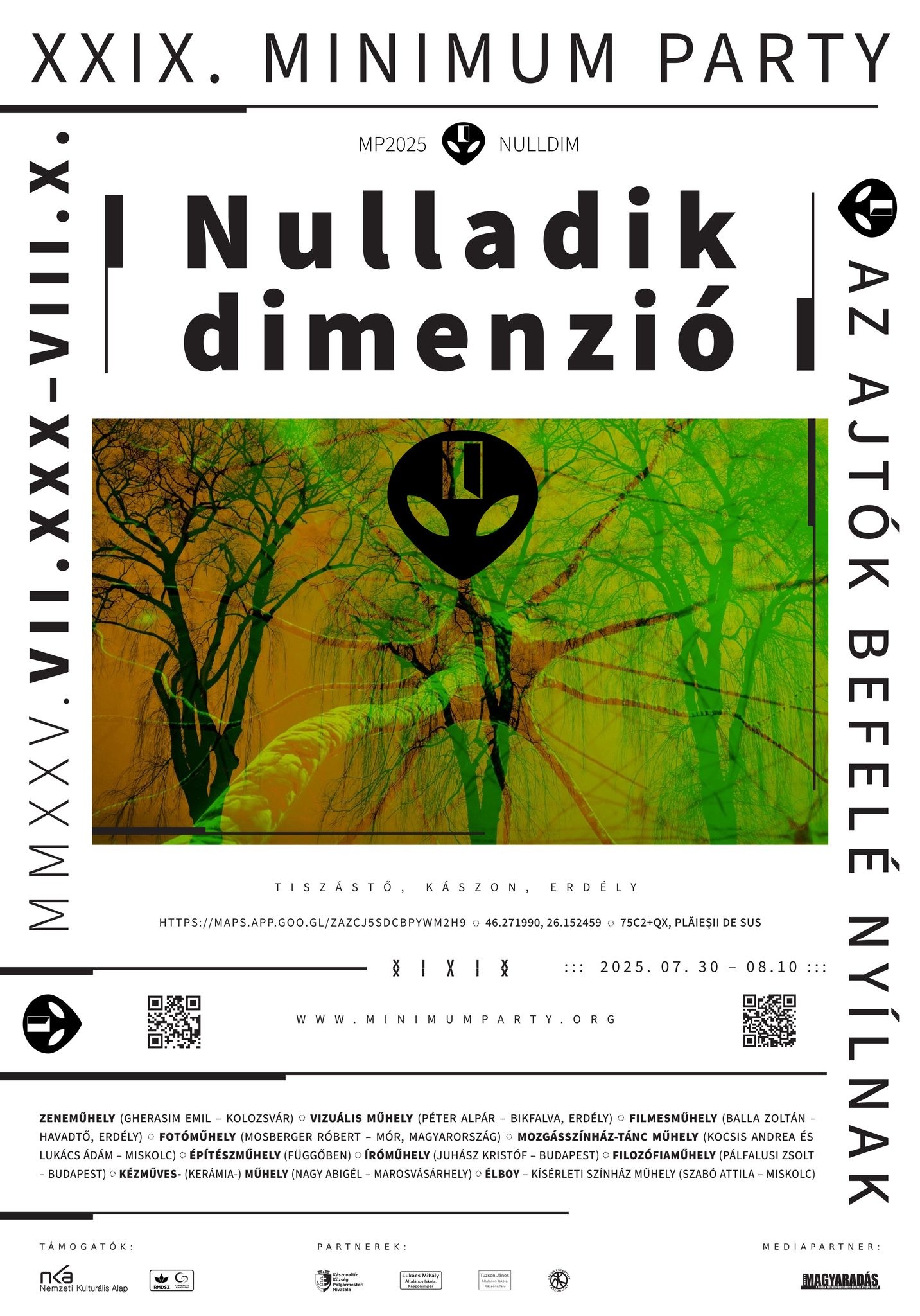 Nulladik dimenzió, avagy Az ajtók befelé nyílnak címmel idén július 30. és augusztus 10. között a 29. alkalommal lesz Minimum Party alkotótábor és szakmai fórum a kászoni Tiszás-patak torkolatánál. A Kászonaltíz községben, természeti környezetben zajló alkotótábor műhelyleírásai és a bejelentkezés lehetősége a minimumparty.org honlapon található.