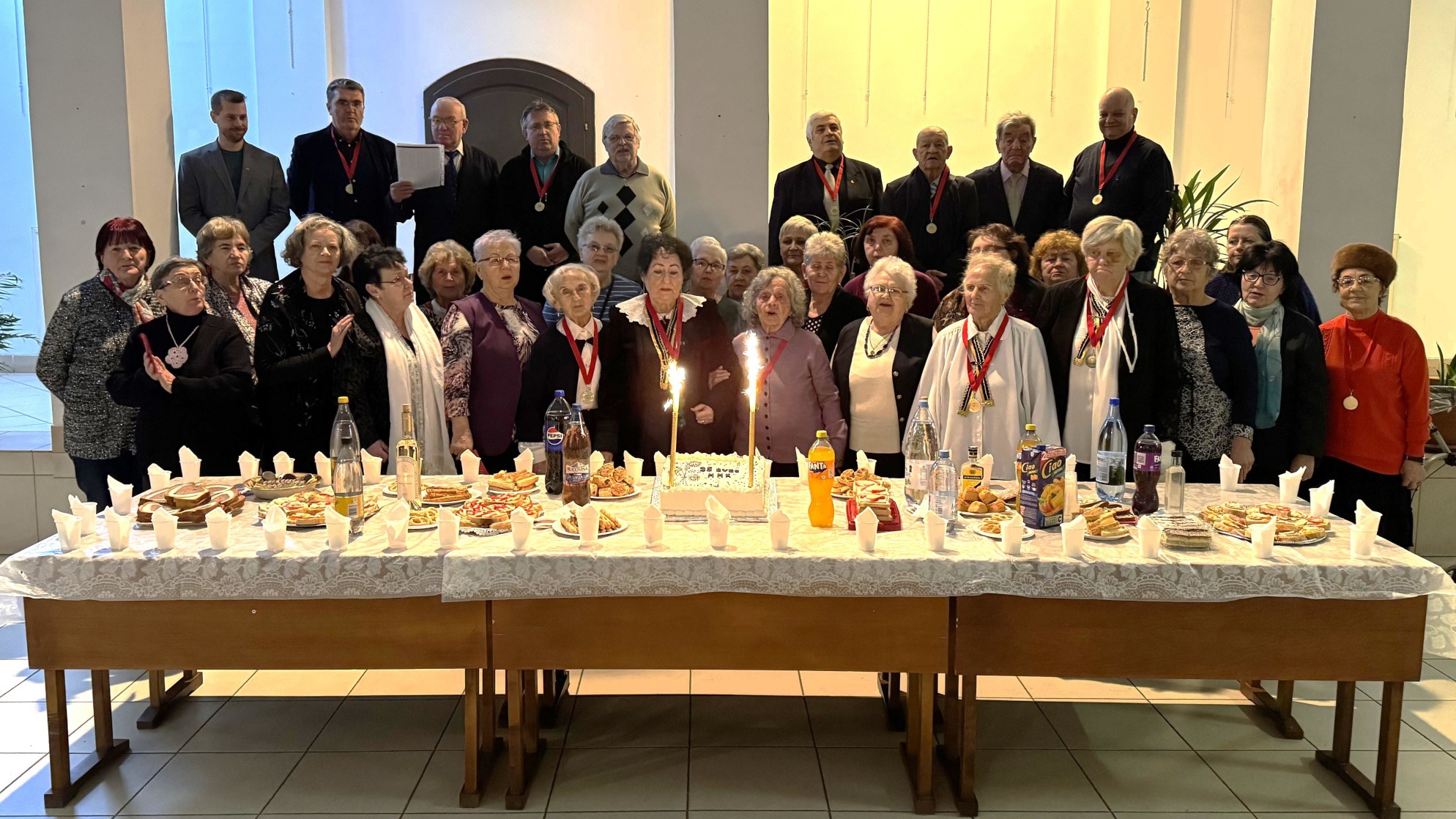 Következett a szeretetvendégség, a hosszú asztal roskadozott a szebbnél szebb tálaktól, a klubtagok által hozott sok finomságtól, és az asztal közepén egy csodálatos, 35 MMK feliratú torta állt. Dendea Silviu elkészítette a megterített asztal mellé összegyűlt klubtagok és meghívottak csoportképét a tortán meggyújtott tűzijátékkal.