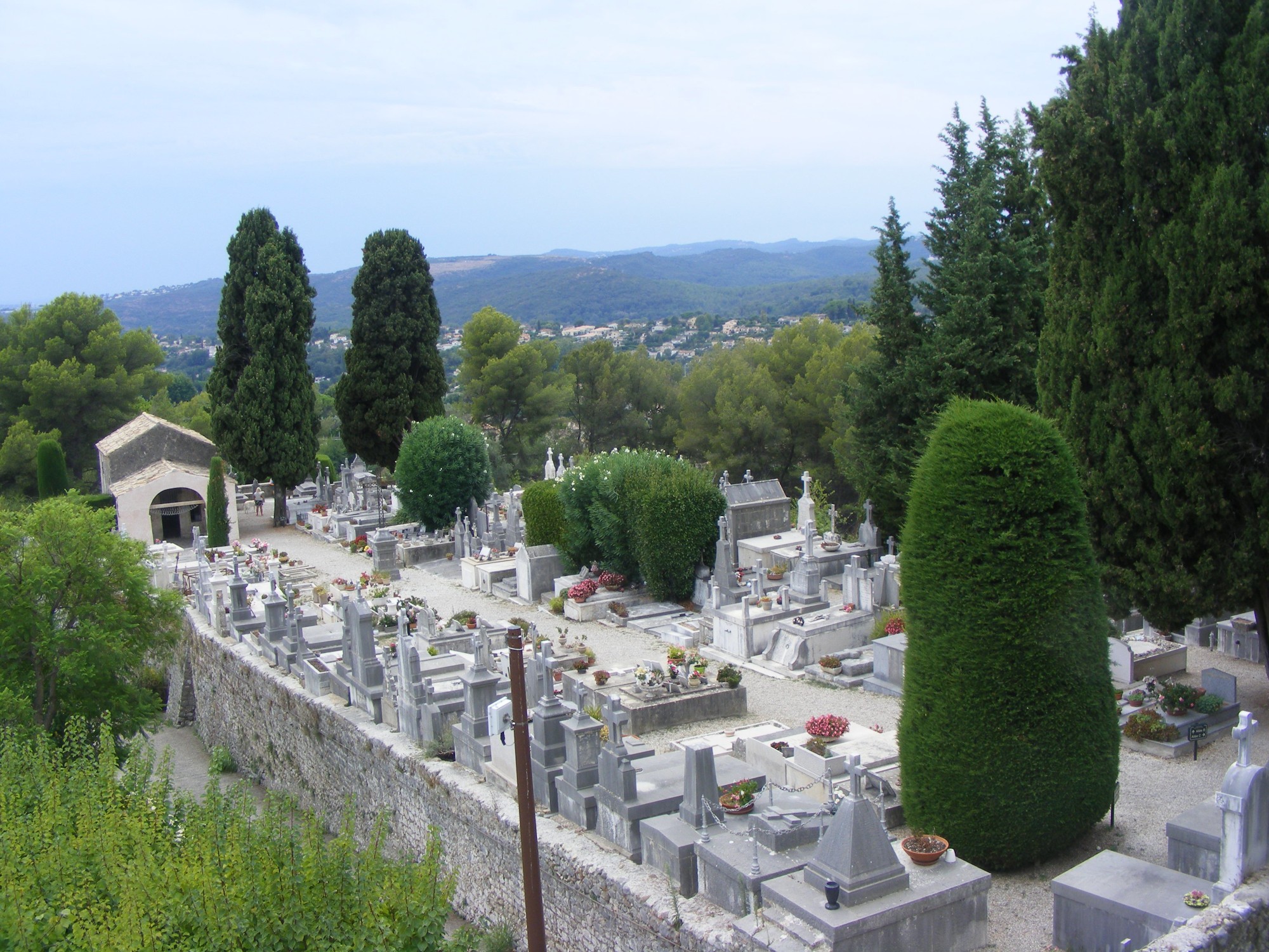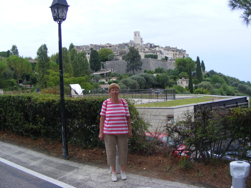 A középkor építészeti remeke, egy óriási kőbástya alatti kapun (Vence-kapu) lépünk be a városba, az autóparkolótól jó kilométernyi gyaloglás után. Első utunk a közeli temetőhöz vezet, ahol egykor, a város keletkezése idején itt épültek az első házak. Ez a temető különleges figyelmet érdemel, mert egy egyszerű sírban itt nyugszik a nagy festő, Marc Chagall is. Úgy érzem, hogy a temető látványa kevésbé nyomasztó, mint sok más temetőé. A temetőben egy sír mellett két szobor is látható – egy itt nyugvó gyerek szüleinek szobra –, mintha szoborrá válva őriznék 11 évesen elhunyt gyerekük sírját.