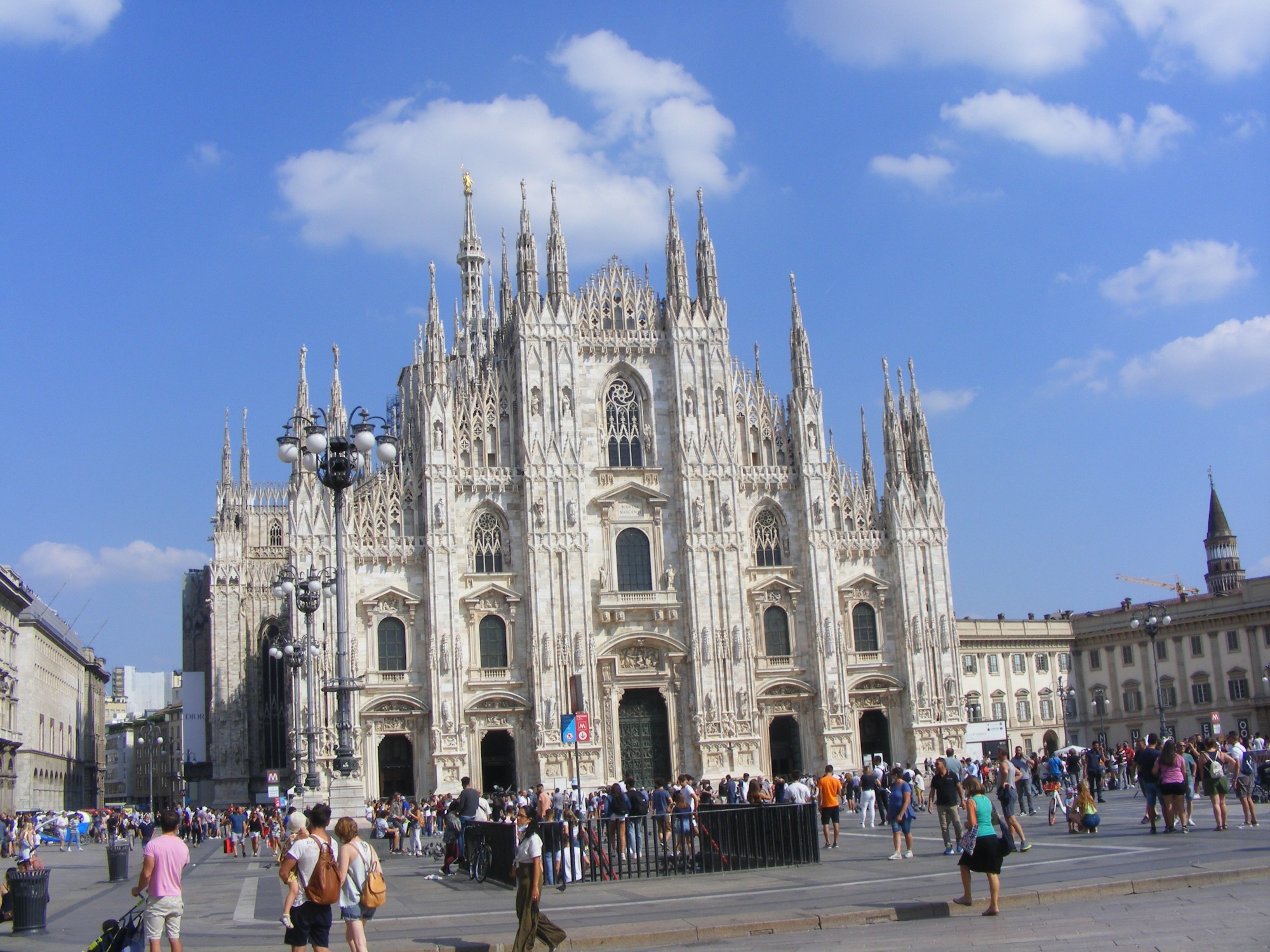 Milánóban az autóbuszról a nevezetes Sforza-kastély (vár) közelében szálltunk le, de mégis a milánói dómhoz siettünk, mert a dóm meglátogatása csoportok részére csak előzetesen egyeztetett időpontban lehetséges, és nem késhettünk el. A turisták közül sokan úgy tartják, hogy Milánóba főleg a dóm miatt kell elmenni, nem csoda hát, hogy a Duomo di Milano előtti téren gyakran hosszú sorok vannak. A dóm és az előtte levő tér Milánó „szíve”. Itália második legnagyobb katedrálisát a 14. században kezdték építeni észak-európai gótikus stílusban, később belsejében megjelentek az olasz reneszánsz stílus jellegzetességei is, csodálatos az összhatás. Megszakításokkal több évszázadon át folyt a munka, még a 20. században is, külső megjelenésében az építészek mindvégig ragaszkodtak az eredeti gótikus stílushoz. A katedrálisba lépő látogatót valósággal meghökkenti a főhajó magassága, a világon alig van párja. Gyönyörű ablakai a virágos gótika alkotásai.