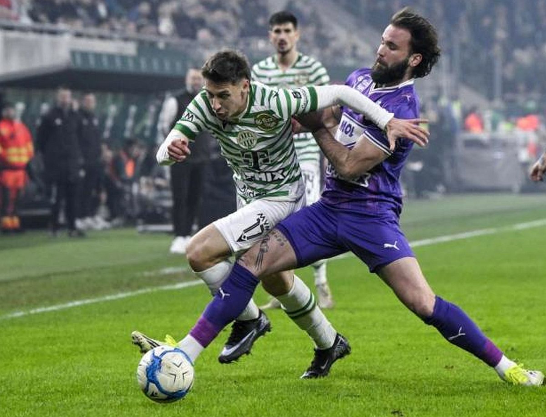 Marius Dumitru Corbu, a Ferencváros (b) és Fran Brodic, az Újpest játékosa a Fizz Liga 21. fordulójában játszott Ferencvárosi TC – Újpest FC mérkőzésen a Groupama Arénában 2026. február 7-én. Fotó: MTI/Purger Tamás