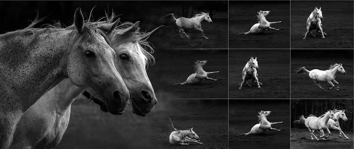 – Az ars poeticámban meg is jegyzem: „Nézni – látni – láttatni; ez a képíró (fotográfus) feladata, miközben egyensúlyoz a képzelet és a valóság határán.” Ha most a Két dühös ló történetét nézzük, nyolc éve fényképezem őket Zalában a bocskai lovas tanyán. Több ló van ott, többségüket már a nevükön ismerem, de ez a kettő mindig egymás mellett, egymás közelében áll, vágtat, lépdel, és elképesztett, mennyire szoros kapcsolat van közöttük…