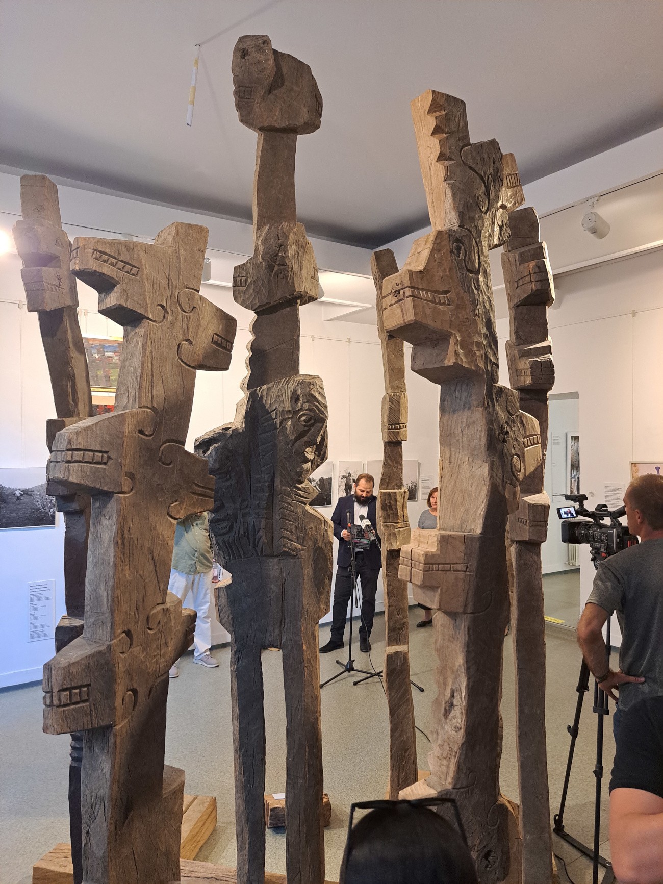 Rendhagyó kiállítás zárult a héten a marosvásárhelyi Art Nouveau Galériában. Az első termet Ion Vlasiu (1908–1997) hatalmas faragott szoboregyüttese, A háború szellemei (Stihiile războiului) uralta. Körülötte szerte a falakon képek, rajzok, fotók, szétszórva, akárha véletlenszerűen, a nagy műhöz kapcsolódó tárgyak, eszközök, részkellékek, naplólapok, kiadványok, önvallomások, sajtócikkek, a másik két teremben a különleges alkotás felújításának folyamatát, a restauráló tevékenységet, a felhasznált anyagokat bemutató műhelykép és műteremhangulat ámította el a látogatókat. A Maros Megyei Múzeum művészeti osztálya vitte közönség elé, és mentette meg az enyészettől a sokoldalú alkotó már szinte feledésbe merült főművét, amely most harmadszorra került a nyilvánosság elé. Először a Velencei Biennalé román pavilonjában láthatták 1976-ban, majd a bukaresti Dalles Teremben 1984-ben a Vlasiu retrospektív kiállításon. Aztán visszakerült eredeti helyére, a művész dédabisztrai nyári lakjának csűrjébe, és kíméletlenül kikezdte az idő meg minden, ami azzal jár. A fa nehezen birkózik meg a természeti elemekkel, A háború szellemei, vagy ahogy egyesek a különös, groteszk szobrot a faluban nevezték, A háború kutyái alapos kezelésre, felfrissítésre szorult. A múzeum szobrász munkatársa, Dorel David Morar, a tárlat kurátora vette kezelésbe. Munkáját kollégái is segítették, dokumentálták, a megnyitóra a mű zaklatott történetét vázoló kiadvány is megjelent, ebben Cora Fodor művészettörténész vállalt oroszlánrészt. Az író, festő, szobrász életművét egykori kollégák, szakmabeliek, műkritikusok is felidézték, gazdag bibliográfiával is ellátták, de a művészetkedvelők számára nyilván a monumentális szobor volt igazán lenyűgöző a maga rendkívül kifejező sokféleségében, a hely szellemét, a Felső-Maros mente tájait, az ottani népi hagyományokat, babonákat, félelmeket, mesterségbeli fogásokat idéző, totemszerű, madárijesztő figuráival.
