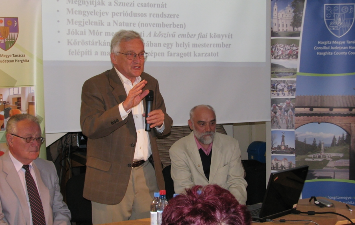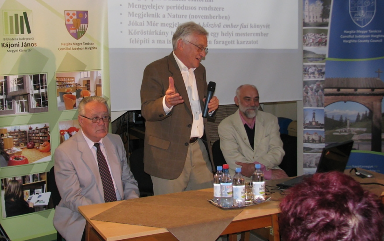 Staar Gyula a Természet Világa folyóiratot népszerűsíti a csíkszeredai Kájoni János Megyei Könyvtárban 2013. június 5-én, Weszely Tibor és a cikk írója társaságában