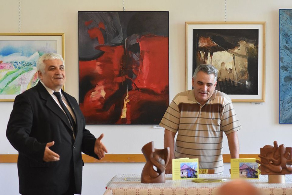 (balról) Nagy László és Czirjék Lajos a megnyitón. Háttérben Deleanu Márta, Gonda Zoltán és Balló Andrea képe