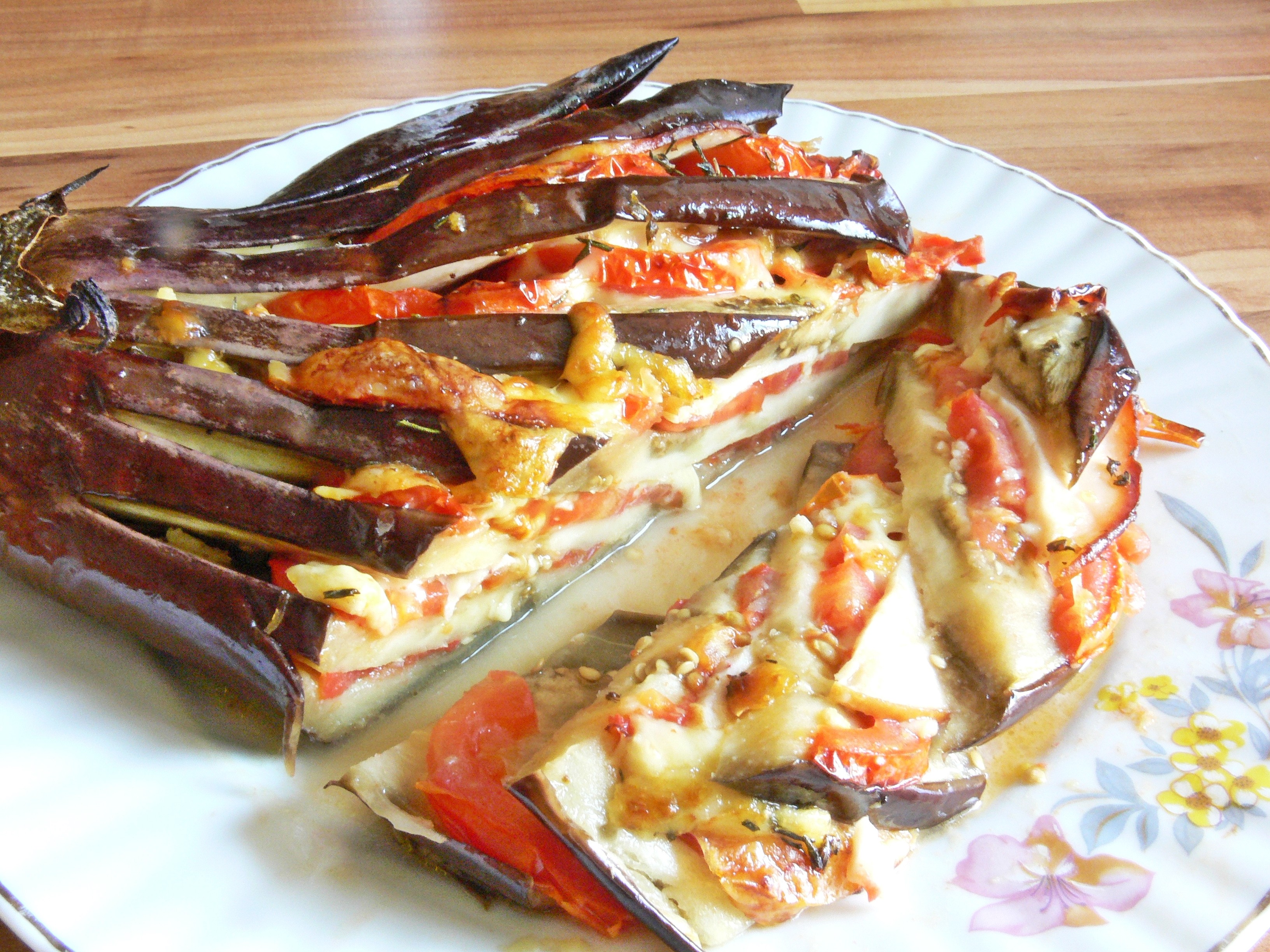 Hozzávalók 4 személyre: 4 közepes padlizsán, 10 cikk fokhagyma, 6-8 paradicsom, 25 dkg vékonyra szeletelt sonka, 20-25 dkg sajt, só, bors, néhány ágacska friss csombor, olívaolaj.