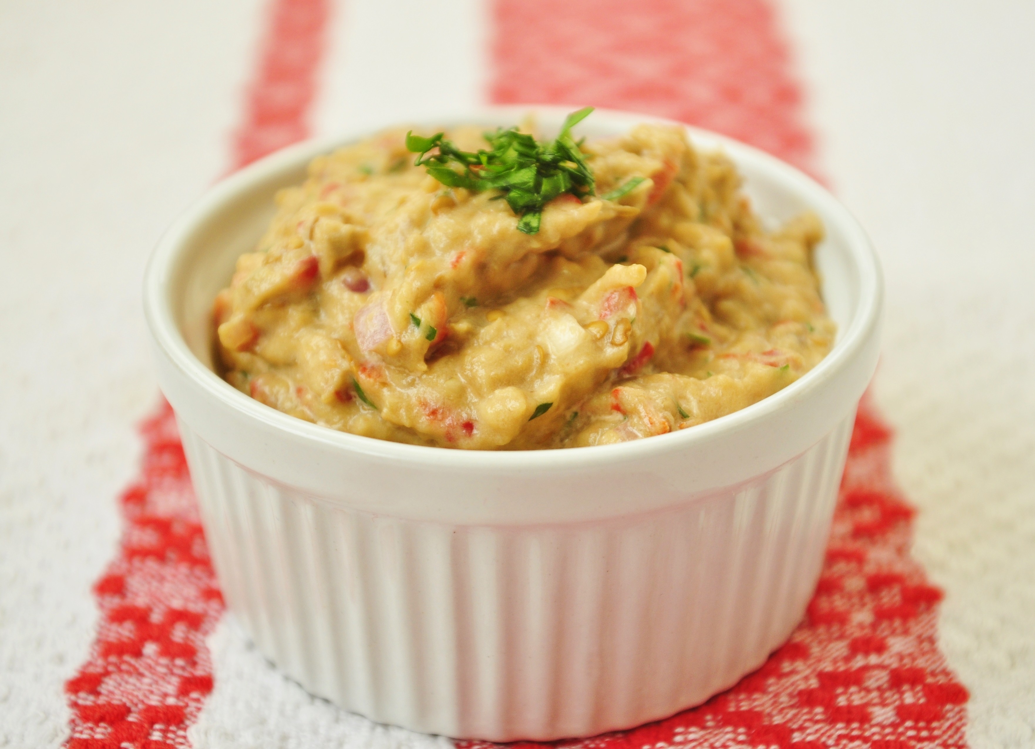 Elkészítése: A paprikát nyílt lángon vagy 230 fokos sütőben addig sütjük, míg héja meg nem feketedik, húsa meg nem puhul. Kivesszük a sütőből, megszórjuk bőven sóval, néhány percre letakarjuk, majd meghámozzuk, és csumáját, magjait eltávolítjuk. A padlizsánt és a sült paprikát összeaprítjuk, majd összekeverjük a finomra aprított hagymával és zöldfűszerekkel. Ízlés szerinti majonézt keverünk hozzá, sóval, borssal és citromlével ízesítjük.