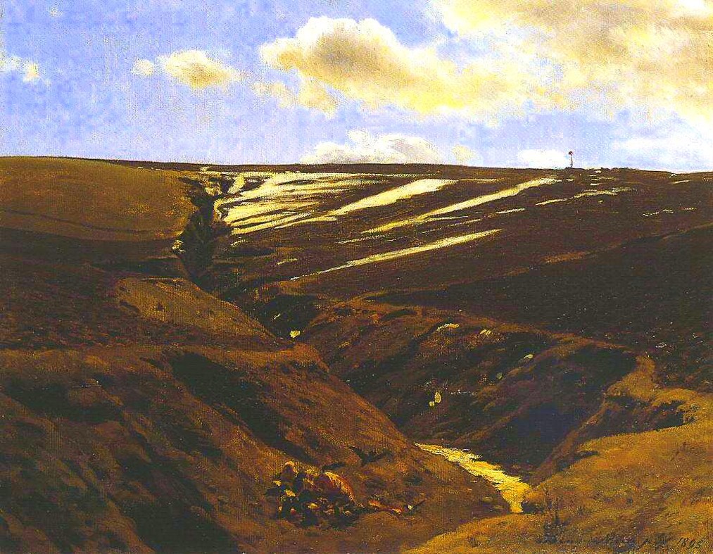 Hóolvadás. A kompozíció egyszerű. A vékony tavaszba hajló ég hideg kékje alatt a széles mező, köztük a horizont vízszintesének csöndes nyugalma. Végtelenbe vesző földek. Középütt kíméletlenül rohan szembe egy vízmosta árok. Jön valahonnan, s fordul valahová – talán a semmiből a semmibe. Jobb partján, az árok fenekén az olvadó hó szürkével mocskos fehér csíkjai, köztük a didergő talaj kemény, hasogatott bordái, a bal part lankás simáján reszkető indulása valami élet zöldjének. Az árok elején pedig, hótól már szabadultan, egy hollóktól tépett dög pirosan málló cafatjai. Akár bármely erdélyi falu határában. A nyirkos föld sötét, meleg rozsdabarnája, a hó fehérje és a vízmosás medrének vöröse. A rét még téli álmát alussza, a napfény azonban leszaggatta róla fehér gyolcsát. Embernek nyoma sincs sehol. És mégis a meztelen föld életről mesél. A zsíros barna termőföld az eleven életek milliárdjainak lehetősége. A tájba feszülő szenvedélyes életerő. A kép több mint impresszionista.