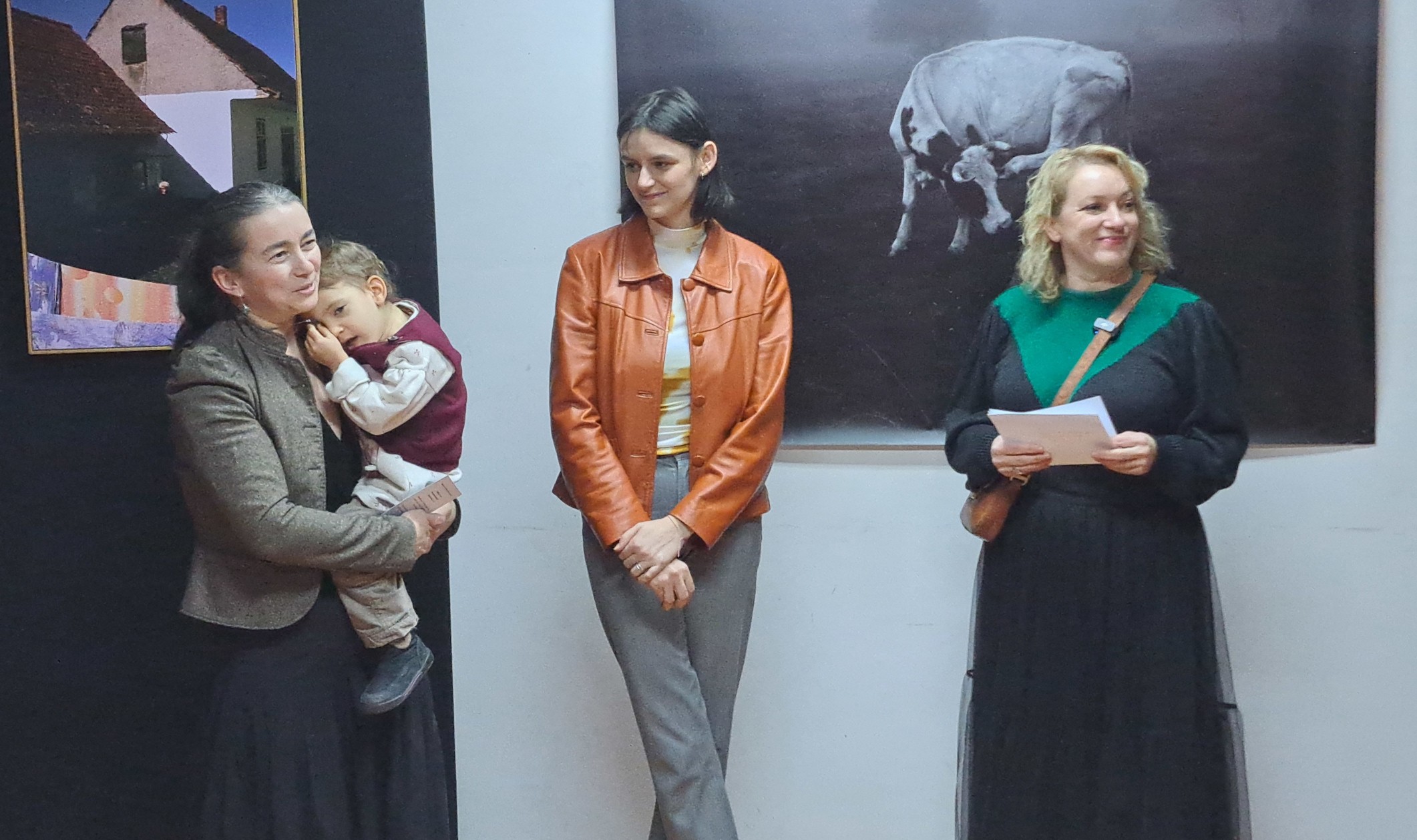 Szász-Bányász Anna fotóművész Már a jövő sem a régi című kiállításának megnyitóján 2025. december 17-én a marosvásárhelyi PhoeBo Egyesület székhelyén, a Bolyai Házban (balról): Márton Krisztina, az egyesület alelnöke kisgyerekével, Szász-Bányász Anna és méltatója, Kerekes Emőke fotográfus