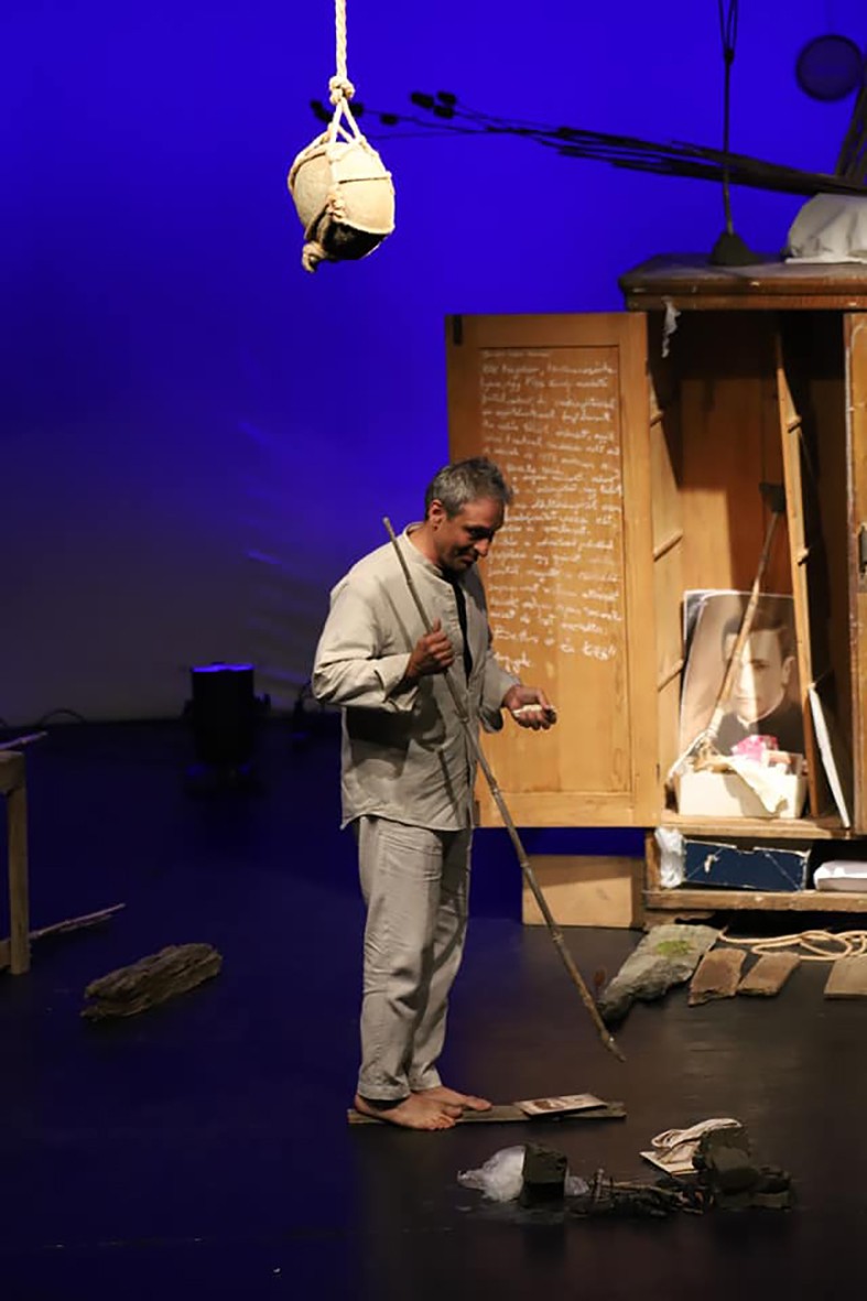 – Aki ebben a változatban kiváló megszemélyesítőre talál Bogdán Zsolt személyében. Nyilván nagyon leegyszerűsítve a lényeget fogalmaztad meg ebben a pár mondatban, de ahhoz, hogy valóban bekövetkezzék a metamorfózis, és katartikus erejű színházi produkcióvá váljék a szöveg, sok mindenre volt szükség. Nem csak egy nagyszerű színészre, egy értő, érző, a színház műhelytitkait jól ismerő, éles szemű rendezőre is, egy fantáziadús díszlettervezőre, empatikus zenei illusztrátorra és így tovább. Mindezt magadra vállaltad.