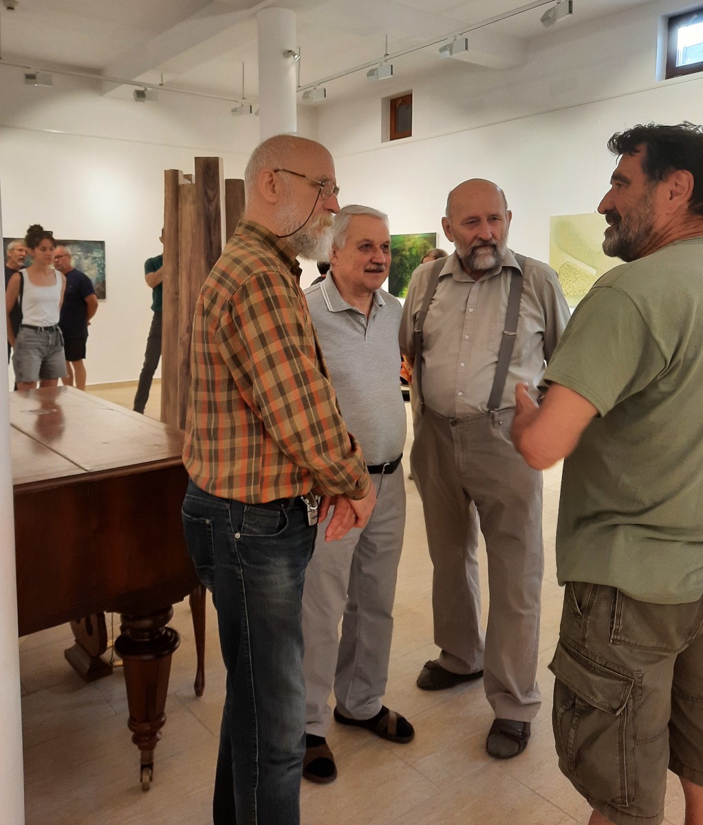 A MAT-tagok ezúttal is egy-egy meghívott művésszel tették teljesebbé a régió művészetének körképét, egyensúlyt teremtve tradicionális és kortárs alkotótörekvések, hagyomány és újítás, idősebbek és fiatalok, érzelmi és értelmi irányulások képviseletében. A kiállítást méltattuk már mellékletünkben akkor, amikor a Kakasülő Galériában állt a figyelem központjában. Az anyaga Szovátán is ugyanaz, illetve egy újabb művel, Kuti Dénes drámai hangvételű festményével gyarapodott. Nem ismételjük meg a múltkori értékelést, azt viszont érdemes hangsúlyozni, hogy a tárlaton azok is újabb élményekkel gazdagodnak, akik már látták az atyhai bemutatón. Ott a Kakasülő és Homloktörő galériák különleges berendezése, belső töredezettsége, a különböző szinteken akciózó fény-árnyék más hatást kelt a nézőkben, mint Szovátán, ahol egyazon szögletes térben, egyformán megvilágítva kerültek egymás mellé a munkák. Atyhában romantikusabb hangulatba kerülhet a látogató, az itteni emlékházban erőteljesebb az összkép sugárzása. Minderről élénk eszmecsere alakulhatott ki a megnyitót követő baráti csevejen, amelyen Bocskay Vincét, Kuti Botondot, Kuti Dénest, Sánta Csabát, Siklódi Fruzsina Erzsébetet és Vinczeffy Lászlót ilyesmiről is kérdezhették az ismerősök.