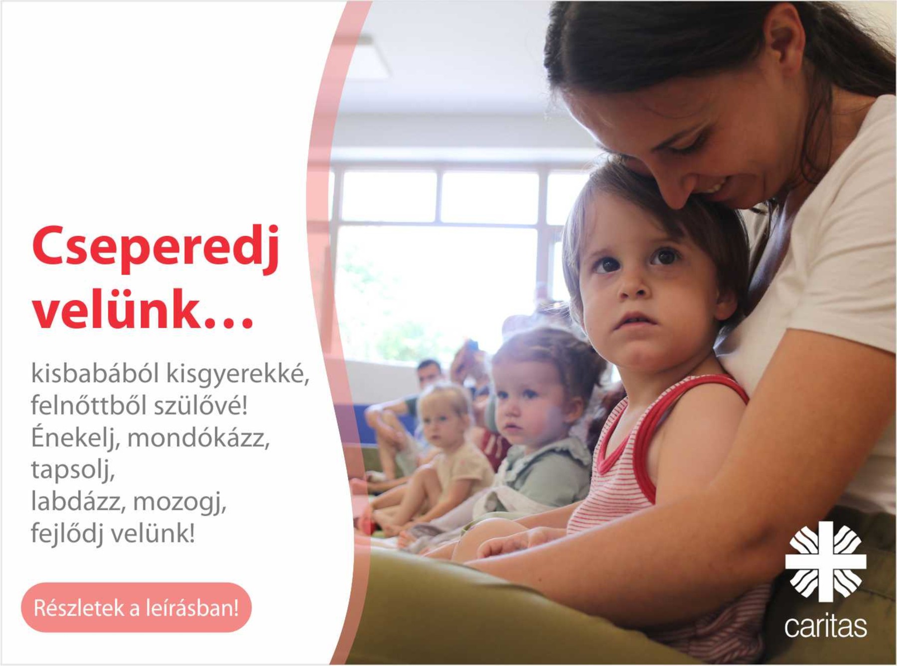 A marosvásárhelyi Cseperedő munkatársai babamasszázsra és játékos készségfejlesztő tevékenységekre várják a kisgyermekeket (két hónapostól kétévesig) szüleik vagy nagyszüleik kíséretében a marosvásárhelyi Caritas Házba, a Mărăști utca 36. szám alá.