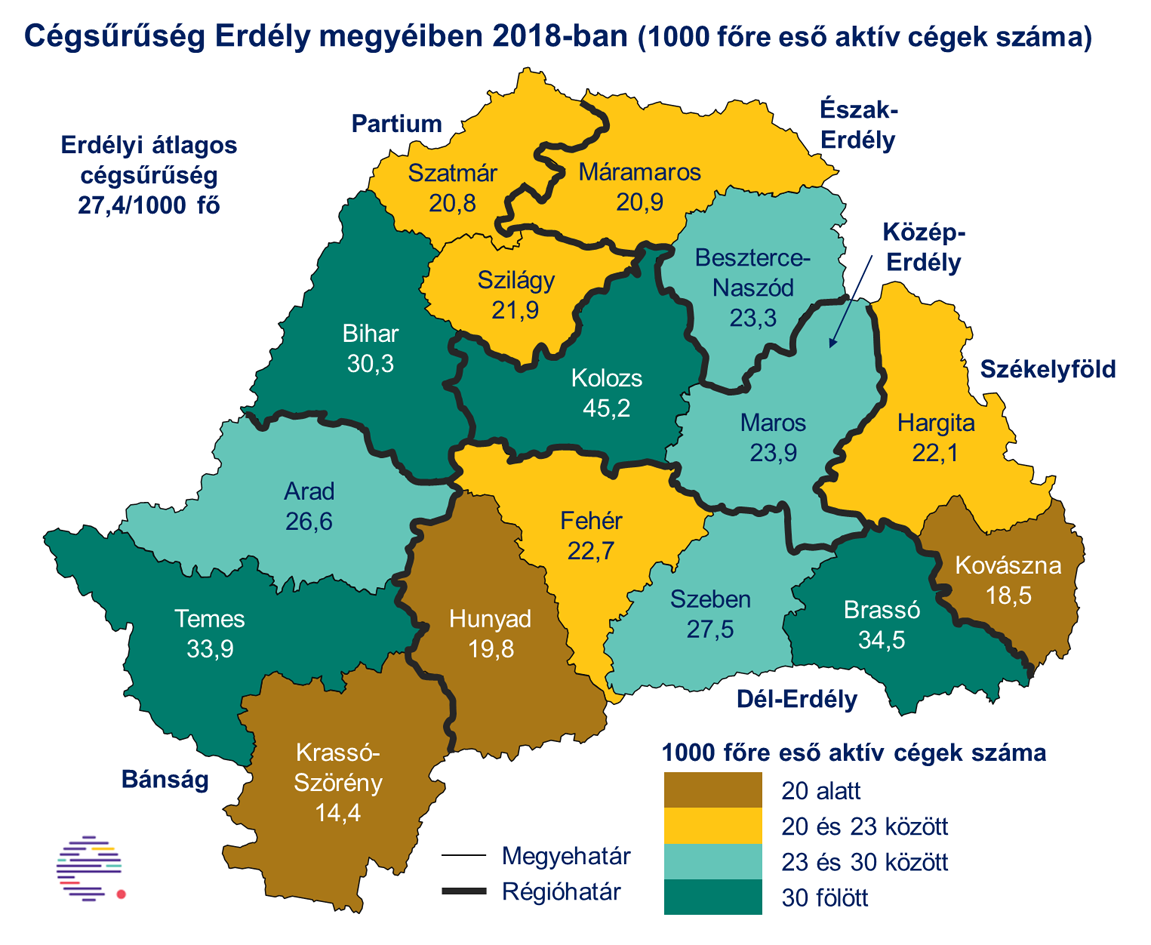 2018-ban 525.184 cég működött Romániában – mutat rá az Erdélystat cégaktivitást vizsgáló elemzése. Ez 1000 lakosra vetítve 26,1 ezrelékes cégsűrűséget jelent. Erős különbség észlelhető a főváros és környéke, valamint az ország többi régiója között: míg Bukarestben 56, Ilfovban 60 vállalkozás jut ezer főre, Erdélyben 27, Havasalföldön 20, Moldvában pedig csupán 18. A fővárosi régió kivételével az átlagos ezer főre vetített vállalkozások, vállalatok száma 22,2.