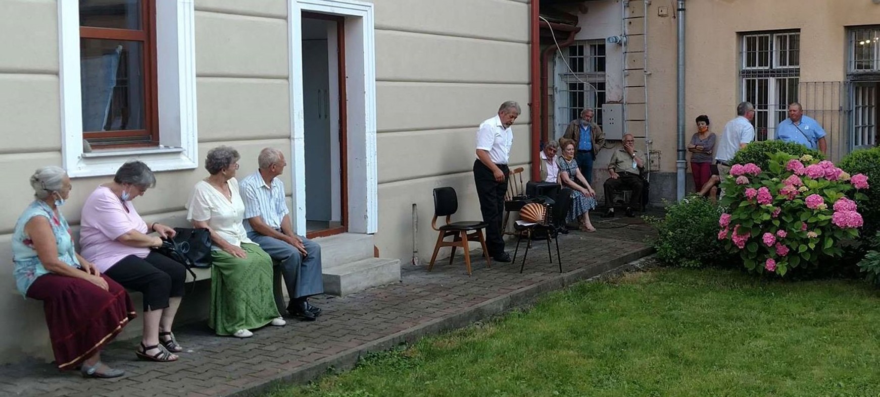 Szakács M. Endre marosvásárhelyi tárlatának megnyitóján a Bolyai téri unitárius egyházközség udvarán