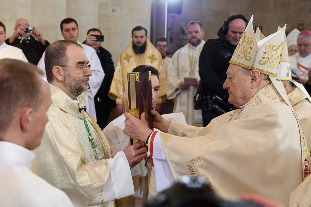 Gianfranco Ravasi bíboros (j) átadja a püspöki jelképeket Kovács Gergelynek, akit püspökké szenteltek, és az erdélyi római katolikus főegyházmegye élére állítottak Gyulafehérváron, a Szent Mihály-székesegyházban február 22-én. Fotó: MTI/Kiss Gábor