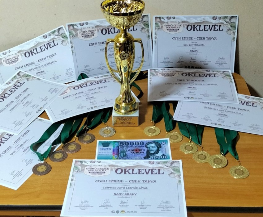 Számon sem tartják már, hány érmet, díjat, elismerést kaptak eddig, hiszen az idei év is sokat gazdagította a családi gazdaság hírnevét. Cseh János elismeri, lassan egy fal kellene a rengeteg elismerés kifüggesztésre, de ezt nem tartják fontosnak. Szerényen, de örömmel jegyzi meg, hogy a néhány napja a Székely Gazdaszervezetek Egyesülete által első alkalommal megrendezett erdélyi Gyümölcsízek sokadalma rendezvényen szinte ugyanannyi díjat nyertek, mint eddig együttvéve: összesen tizenegyet. Lekvárjaik és szörpjeik ízét a szakemberek 6 arannyal, 1 ezüsttel és 4 bronzzal jutalmazták, csipkebogyólekvárjukkal a nagyaranyat is elhozták. Hozzáfűzte, ezúttal több mintát küldtek be, mert tudni szerették volna, hogy a kéttucatnyi termékükből csak egy-kettő vagy több is jó. Az elért eredmények azt mutatják, hogy „jól csináljuk, elég jók vagyunk”.