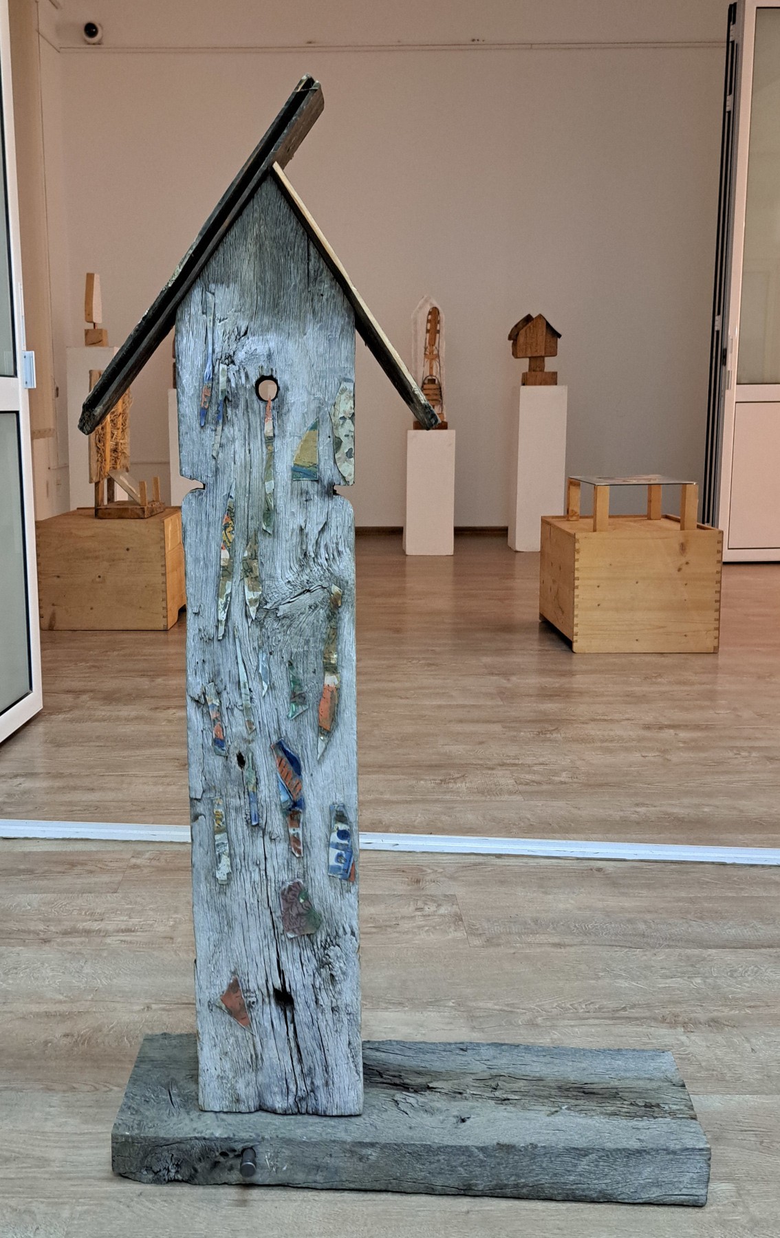 Nem adott címet a kiállításnak, de úgy véli, anélkül is nyilvánvaló, hogy mindaz, amit elénk tárt, a HAJLÉK fogalmába illeszthető. Ez a kissé régies fogalom házként, lakásként, otthonként is értelmezhető, olyasmiként, ami biztonságérzetet, nyugalmat, békét sugall. Ösztönösen és tudatosan is szükségük van ilyenekre az embereknek. A hajlékhoz ősidők óta a szakralitás jelei, jelképei is társultak, a népi életmód ezekhez igazodott. Ő is eszerint próbál élni, viselkedni, az ebből fakadó, az ilyesmiben rejlő történeteket, érzéseket, hangulatokat igyekszik feleleveníteni, mozgósítani alkotásai révén. Külön-külön sem látta el címmel a munkákat, bár mindeniket meg tudná nevezni, de nem a saját történeteit akarja ráerőltetni a szemlélőkre, azt szeretné, ha a látottak nyomán a maguk történetére, emlékére, élményére lelnének. Természetes anyagok uralják a tárlatot, elsősorban a fa, régi deszkák, gerendák, házelemek, bútordarabok, minden, amit a környezet, a természet felkínál, talált tárgyak, fémdarabok, üvegcserepek, a föld nyújtotta egyéb egyszerű kellékek, anyagok, festékek, amelyek játékosan, nyersen, illő arányban sugározzák az otthon, a hajlék melegét, biztonságát. És szimbólumként is felfoghatók, legyen szó akár szoborszerű plasztikákról, akár képekről, domborművekről. Szinte mindenik mű felvillantja a ház, a tető formáját, akár egy nagyobb kompozícióba is illesztve, itt is, ott is ajtóra, ablakra, kapura vélünk ráismerni, kültéri feszület, ikonszerű megoldások idézik meg a hitvilág szimbólumait. Az egyszerűség nem jelenti azt, hogy mindez csak úgy magától jön. Az alkotás folyamatát Éltes Barna is hosszasan kiérleli, nála is fontos az ötlet, a gondolat kikristályosítása, amibe értelemszerűen beleillik a kísérletezés is, a határok feszegetése, amíg úgy nem érzi, hogy az új munka is magában hordozza mondandója lényegét, teljesíti ars poeticai elvárásait.