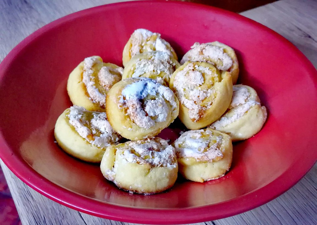 Szükséges hozzá: 40 dkg liszt, 25 dkg margarin, 1 dl tej, 1 dkg élesztő, 3 tojássárga, 1 evőkanál cukor,1 citrom reszelt héja, csipetnyi só. Az élesztőt cukorral, tejjel felfuttatjuk. Mindent összegyúrunk, és egy órára hűtőbe tesszük. A 3 tojásfehérjét 35 dkg cukorral kemény habbá verjük és hozzákeverünk 25 dkg kókuszreszeléket. Három cipóra osztjuk a tésztát, és kb. fél cm vastagságúra, téglalap alakúra kinyújtjuk. Megkenjük a kókuszos vagy diós habbal, felcsavarjuk, és ujjnyi szeletekre vágjuk. Tepsibe egymás mellé helyezzük, majd 180 fokon 5–6 perc alatt szép rózsaszínűre sütjük. Porcukorral meghintjük, a kókuszreszeléken kívül dióval, mákkal is készíthetjük.