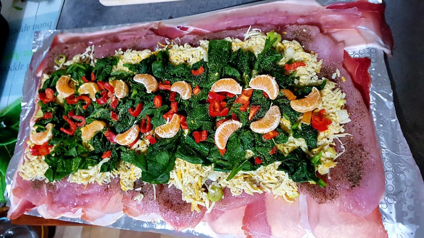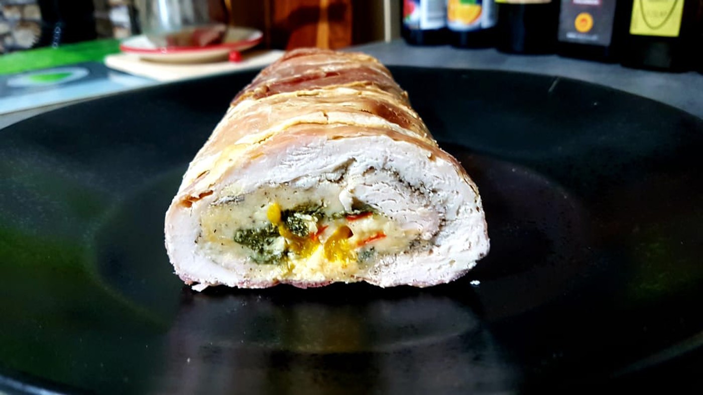 Egy nagyobb darab alufóliát kiterítünk, ráhelyezzük a baconszeleteket. 40 dkg pulykamellet felszeletelünk (mintha prézlis szeletnek készítenénk), kipotyolunk (nem túl vékonyra). Sózzuk, borsozzuk mindkét oldalán. Beborítjuk a baconszeleteket a hússal. 20 dkg reszelt sajtot 3 tojással, sóval kikeverünk, és rákenjük a húsra. 20 dkg spenótot (megtisztítva) borítunk rá, elegyengetjük, majd 2 darab mandarint gerezdekre szedve, 1 kisebb piros kápiapaprikát apró kockára vágva a spenótra helyezünk. Kevés fokhagymaporral, sóval, borssal meghintjük. Az alufólia segítségével felcsavarjuk, kétfelől becsavarjuk a végét, majd tepsibe helyezzük. Kevés vizet öntünk alája, és 180 fokon 40 percig sütjük. Utána kibontjuk a fóliát, és pirosra sütjük. Miután kihűl, szeleteljük. Bármilyen köret illik hozzá. Hidegen salátával, friss zöldséggel is fogyaszthatjuk. Nagyon mutatós.