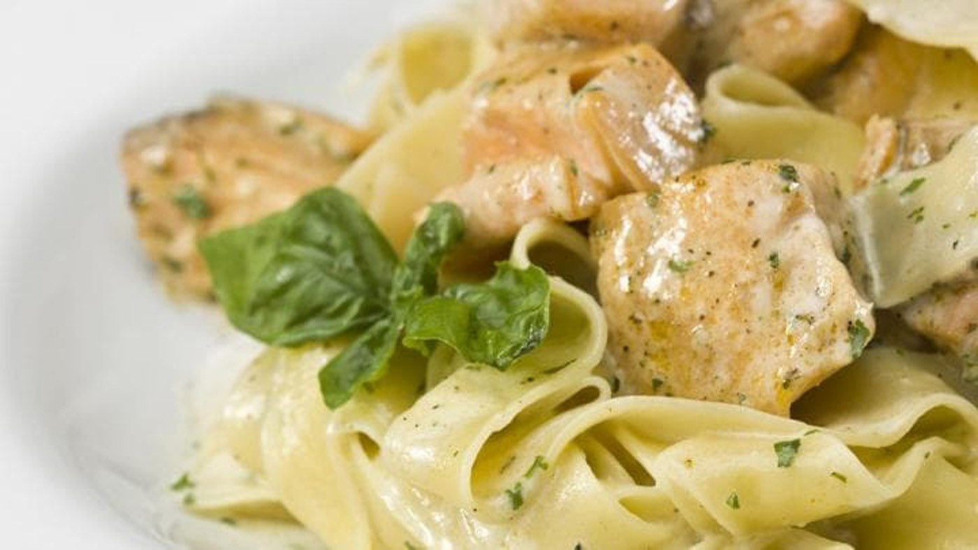 25 dkg tagliatellét sós vízben kifőzünk, majd leszűrjük. Kis fej hagymát apróra vágunk, kevés olívaolajon, 5 cikk zúzott fokhagymával, 3 evőkanál száraz fehérborral, sóval, darált borssal, csipetnyi szerecsendióval puhára párolunk, kb. 3 dl tejszínnel addig keverjük, amíg besűrűsödik. 20 dkg füstölt lazacot tetszés szerint feldarabolunk, és a forró tejszínhez keverjük. Nagy csokor petrezselyemzöldet is adunk hozzá. Kevés parmezánt is főzhetünk a tejszínbe, más reszelt sajtot is. A tányérra először a tagliatellét helyezzük, majd ráöntjük a lazacos mártást. Tálalhatjuk úgy is, hogy tagliatelle, rá a füstölt lazac, és leöntjük a mártással. Ilyenkor nem adjuk a mártáshoz a füstölt lazacot. Citromkarikával tálaljuk. Aki szeretne, párolt brokkolit is tehet a mártásba, különleges ízvilága van.