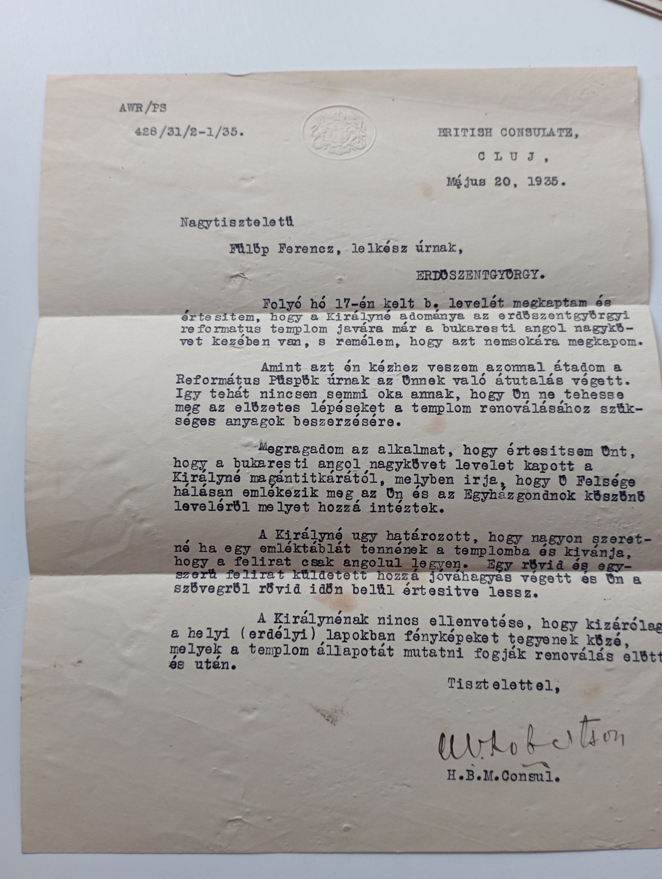 4. köszönőlevelek az angol konzul és Mary királyné személyi titkára közvetítésében Nt. Fülöp Ferenc lelkipásztor és a presbitérium felé az erdőszentgyörgyi személyes látogatás (angol konzul) és a makett elküldése hozományaként