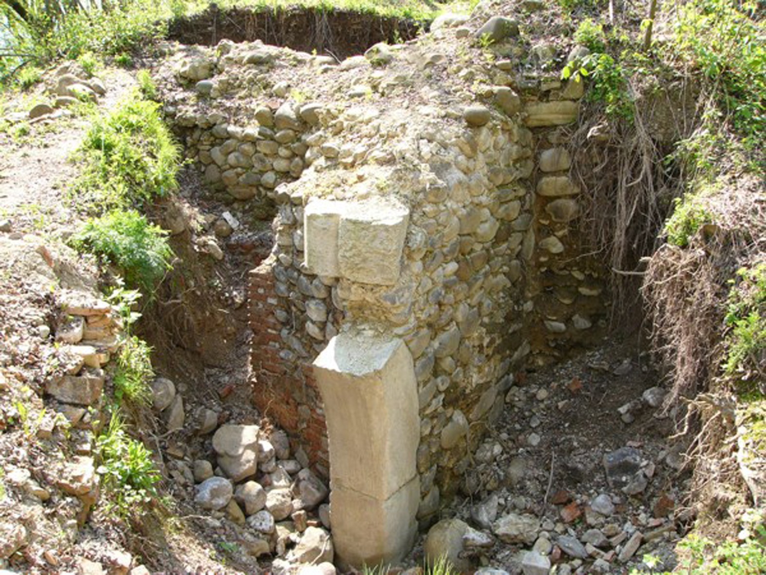 Ma már csak a domboldal peremén látható a kőfal maradványa, cserjével, fákkal benőve.