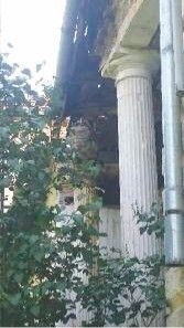 A két dór oszlopos fedett veranda, amelyről a kastély főbejárata nyílott, a szimmetriatengelyből kiesett a későbbi toldás és a homlokzatátalakítások során.