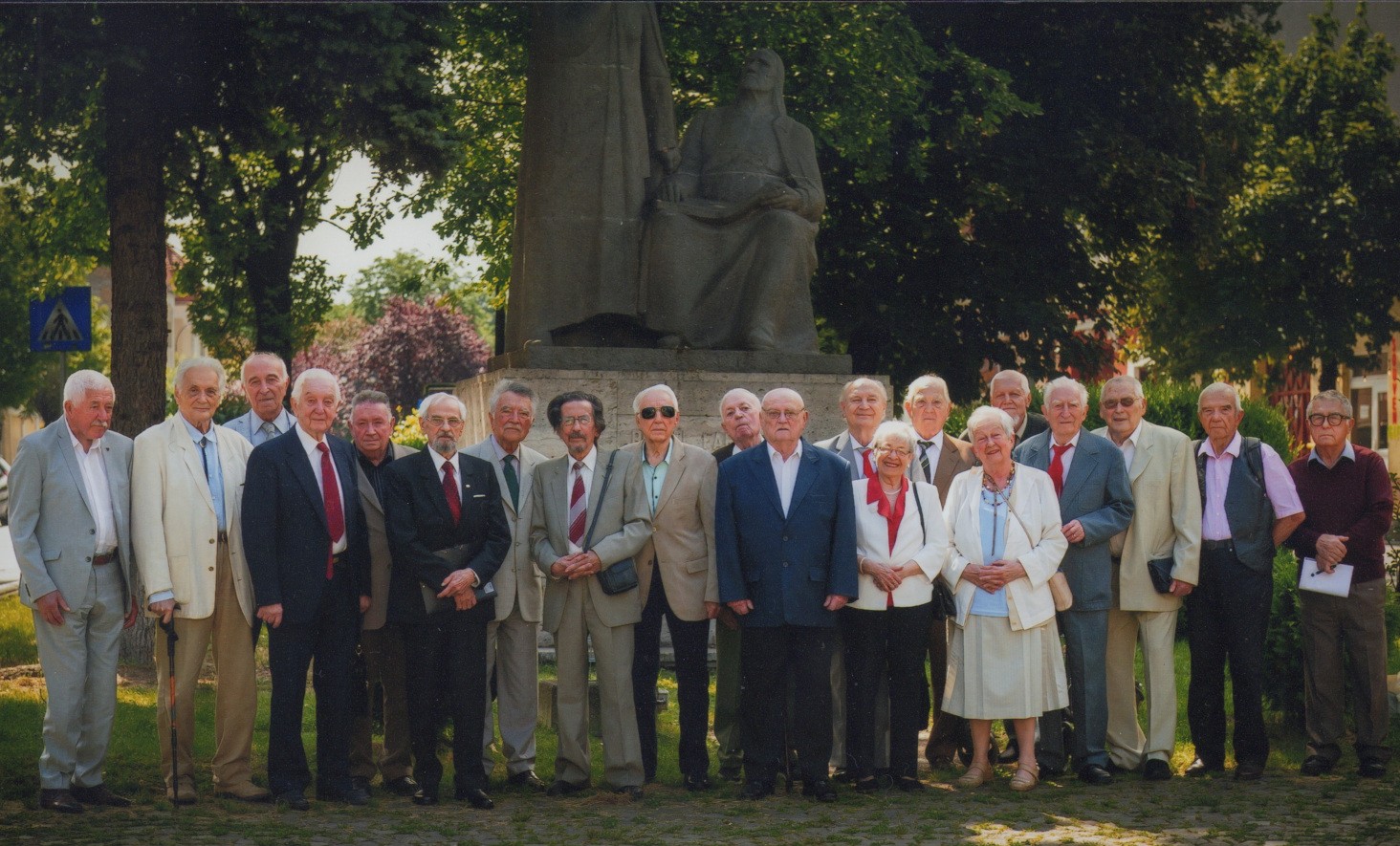 Nos, a találkozóra kijelölt napon, vagyis június 1-jén délelőtt 11 órakor gyülekeztünk a Bolyaiak szoborcsoportja előtti téren, ahol számba vettük és üdvözöltük egymást, majd egy csoportkép is készült a megjelentekről. Megál-lapítottuk, hogy az egykori négy osztály végzős diákjai közül összesen 18-an jöttünk el közelből vagy távolból, ketten határon túlról. (Lásd a fényképet.)