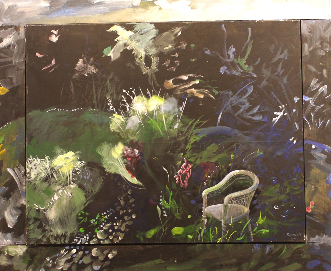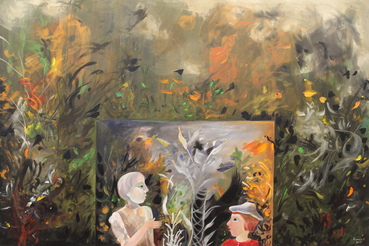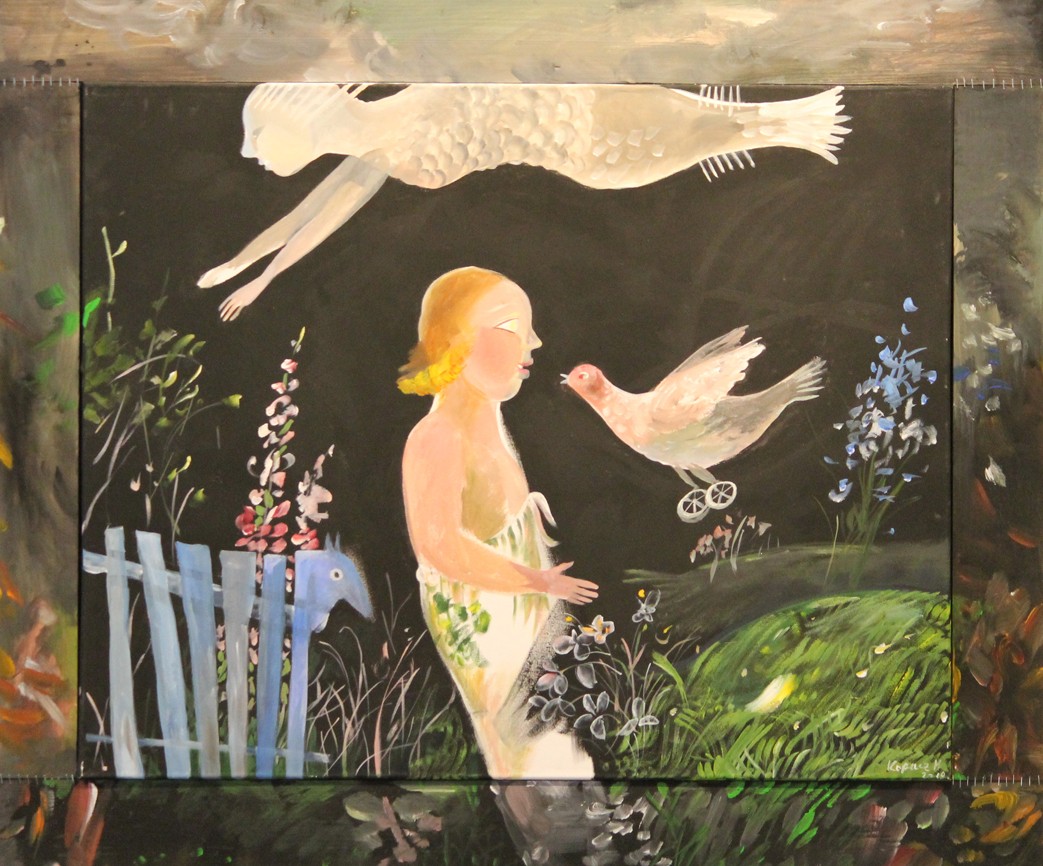 Kopacz Mária mostani tárlatának címe A kert, és nem véletlenül időztem el a bibliai példáknál. Hiszen minden festő a teremtés heroikus munkáját próbálja megismételni, amikor szabott keretben, üres felületen, teljesen előzménytelenül létrehoz egy új világot. Formákat és színeket választ, mérlegeli az arányokat, egyensúlyt teremt, tehát rendet csinál a káoszban. Egyébként közvetlenül is felidézi Kopacz Mária több képe a Teremtés könyvét, például az Ádám és Éva című festmény vagy Az angyal kertje, és persze a gyakran előforduló galambmotívum. Talán arról a galambról van szó, amely csőrében az olajággal hírül hozta hajdan, hogy vége az özönvíznek.