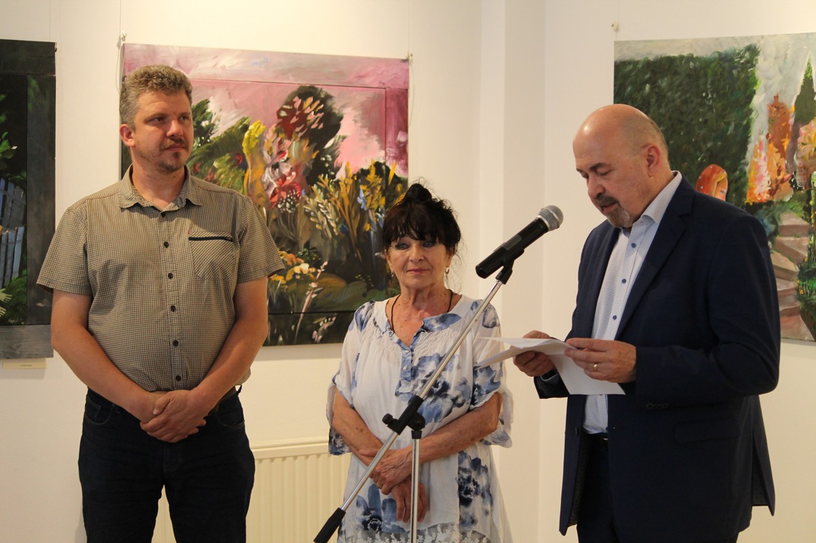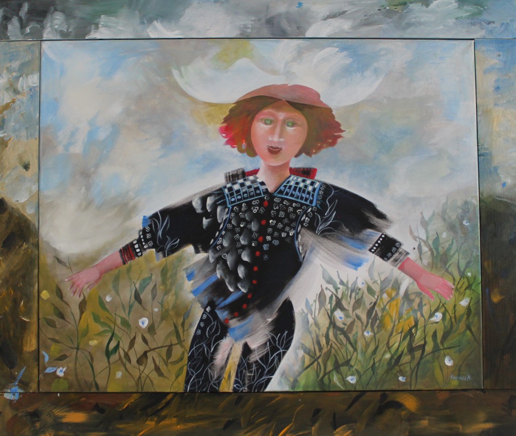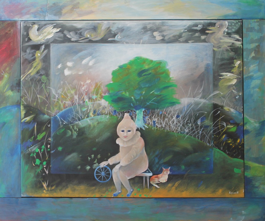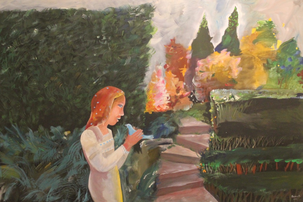 Ugyanis Kopacz Mária kertje nem a romlás, nem a kétségbeesés, nem a reménytelenség színtere, hanem a teljességé. Művészi pályáján is újabb beteljesülés ez. Van ezekben a most látható képekben folytonosság az előzőekhez képest, és van egészen fontos váltás is, de erre még visszatérek. Beteljesülést jelentenek a kertek olyan értelemben is, hogy egytől egyig a szabadság titkát keresi bennük a festő. Kopacz Mária művészetében még a festményeknél értelemszerűen levegősebb grafikáknak is a telítettség volt az egyik jellemzőjük, nem textúraként, hanem kompozícióként, ugyanis a művész valamiféle működő szerkezetté változtatta az egész teret, néha a szó szoros értelmében is: kerekek, drótok, egymáshoz lazán kapcsolódó fantázia-alkatrészek nyűgözték le a nézőt. Alapjában véve a jó kép mindig működik, mint egy szerkezet vagy szervezet, a rossz képen is ott lehet sok minden, de nem indítja be, nem hozza mozgásba a képzeletünket. Az ő művei mindig provokálták, mindig megmozdították a fantáziánkat. Még a sötétebb tónusú festményeit is valami gyermeki derű vagy legalábbis gyermekinek álcázott irónia jellemezte, és ez a látásmód mindmáig változatlan, legfeljebb több ma már Kopacz Máriában is a kétely, és a groteszk helyét itt-ott az abszurd foglalja el, mint például az egyik képen a kerekeken guruló galamb. De ami a lényeg: pontos választ kapunk arra a gyötrő dilemmára, hogy miképpen lehetünk szabadok. A kert ugyanis önmagában a természet rabul ejtésének szimbóluma, úgy nézünk be a kerítés rácsai között a fákra és bokrokra, mintha a rabokat figyelnénk egy börtönben. Ám ez csupán a látszat. Illetve csak akkor igaz, ha azt képzeljük, hogy a teremtett világ, vagyis a kert a rabságot, ami pedig kívül van, a szabadságot jelenti. Ha így lenne, értelmetlenné válna minden műalkotás, hiszen behatárolt térben létezik a kép is, akárcsak a kert. Érzékelteti is ezt a kitörési lehetőséget, ezt a szabadságként is értelmezhető korlátlanságot Kopacz Mária azzal, hogy képeinek kerete is része a fesménynek, de csupán ironikus kísérlet ez a határok felszámolására, és ő tudja a legjobban, hogy ez lehetetlen. Művei azért telítettek, vagyis azért nincs a kompozíción rés, mert a szabadság nem kívül van, hanem belül. A szabadság is ott van a kertben. Tessék megfigyelni, csupa maszk, csupa jelmez ez a művészet. Mi más az átöltözés, a bohócruha mondjuk, hogyha nem az énünktől, a korlátainktól való megszabadulás lehetősége? Mi más ez a sok madár, hogyha nem a felröppenés, a felfelé való szabadulás nagy esélye? Mi más ez a sok kapu vagy lépcső, hogyha nem a távozás felkínálása, a teremtés előtti világba vagy legalább az érintetlen Édenbe való visszatérésre való biztatás? Asszonyok, férfiak, gyermekek, koboldok, angyalok, halak, madarak mind szabadulhatnának, ha akarnának. Meg aztán miért fordul elő többször is a színpadon belüli színpad, a kereten belüli keret, a kerten belüli kert ezeken a képeken? Azt hiszem, a magyarázat egyszerű: a szabadság itt van bent, bennünk van. Abban a keretben – már-már azt mondtam: képkeretben –, amelyben élnünk adatott. Lehet, hogy felrepül a madár, de úgyis visszatér. Lehet, hogy egy pillanatra kilép a kertkapun az asszony vagy a férfi, de úgyis visszafordul. Lehet, hogy a kerítésen átnyúl a lomb, de a gyökerek úgyis ott maradnak bent. Minden itt van, a bűn is, az ártatlanság is, csak tudni kell különbséget tenni. Kopacz Mária művészete minden szempontból eljutott mára a szintézisig. Alakjai, az emberek, állatok, madarak már nem vergődnek a kert kuszaságában, hanem kontrasztban vannak a növényi háttérrel. Nagyon érdekes, hogy újabb képeinek az eddigiekhez képest egyszerre lett háttere és előtere, hátul még titok van, de elöl már világosak, egyszerűek, sőt, szinte egyszínűek a szereplők, mintegy azt jelképezve, hogy ebben a teremtett világban, a rácsos kerítéssel körbevett kertben meglelték szabadságukat, tehát önmagukat.