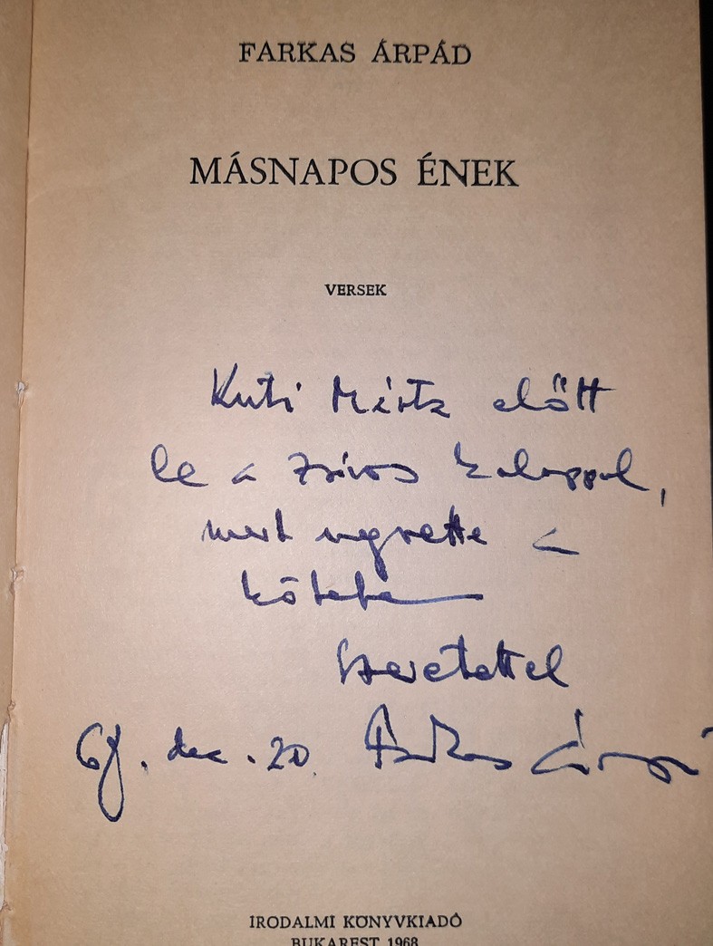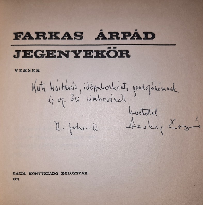 Ebben a kötetben jelentek meg a Mikor az öregemberek mosakodnak, Lipovánok, Kőrösi Csoma Sándor, Jegenyekör, Avaron, Sectio caesarea című kedvenceim, s dedikálta is: „Kuti Mártának, időszakonkénti gondozónémnak és az ősi cimborának szeretettel Farkas Árpád. 72. febr. 12.” Merthogy amikor Vásárhelyen kórházban volt kivizsgáláson, én látogattam, s vittem neki, amire szüksége volt, régi jó cimborához méltón. Hisz már tíz éve, így vagy úgy, de sorsunk összefutott.