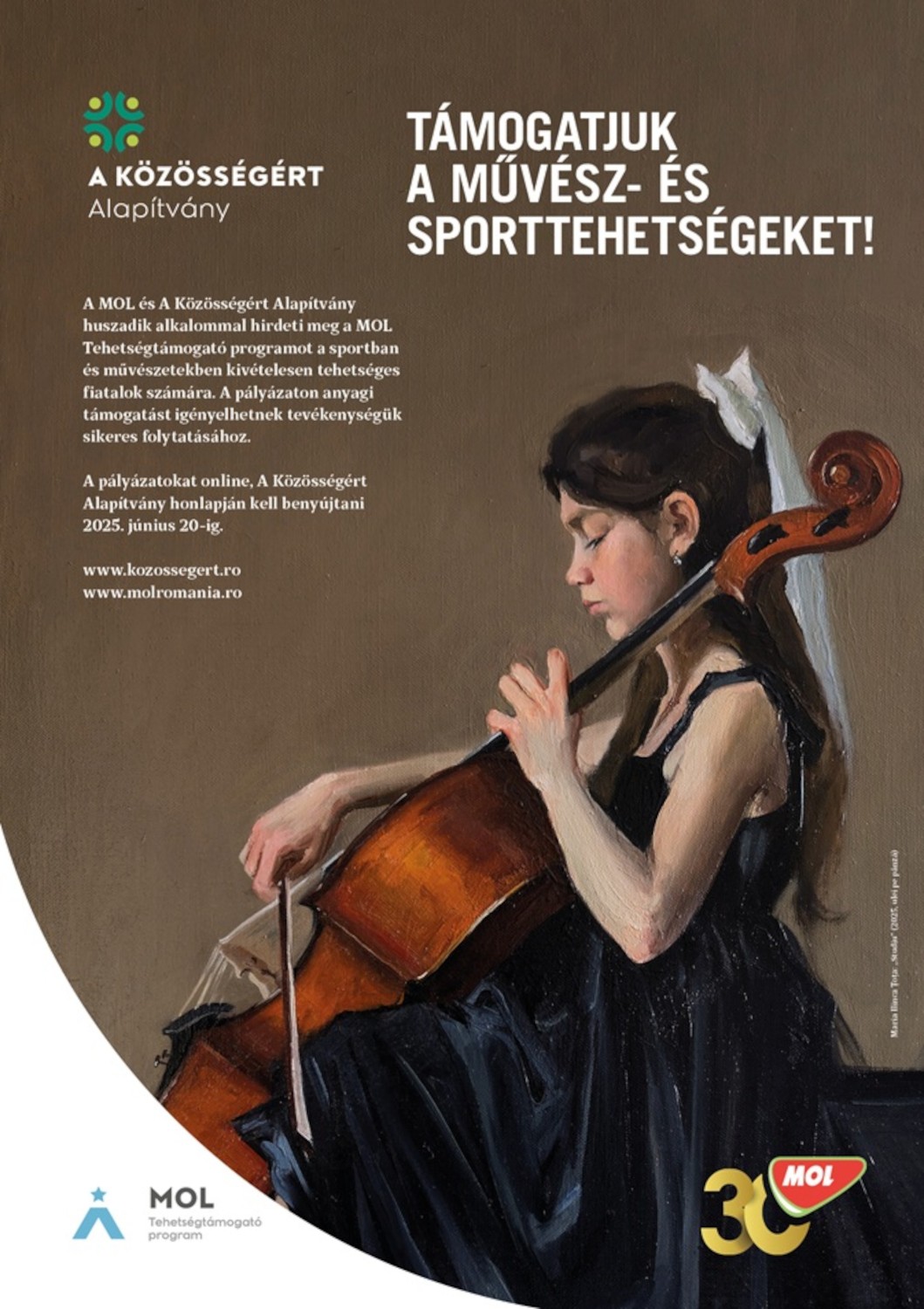A MOL Tehetségtámogató keretében 8–18 év közötti sportolók és művészek pályázhatnak egyénileg vagy csoportosan, csapatok, együttesek, kórusok és színjátszók. A pályázatokat 2025. június 20-ig online lehet benyújtani A Közösségért Alapítvány honlapján (www.kozossegert.ro). A pályázatnak tartalmaznia kell az utóbbi két évben elért eredményeket, a felkészítő tanár vagy edző ajánlását, a jövőbeni célok megfogalmazását és a célok eléréséhez tervezett pályázati költségvetést. Az idei kiírás támogatási alapja 560.000 lej.