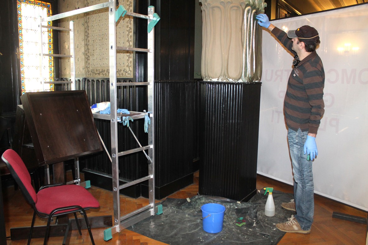 – A falak tisztítása van folyamatban, hiszen a hatvanas, sőt a hetvenes években is, amikor a Kultúrpalota utolsó nagy javítása volt, néhány részletet átfestette, más színre, más koncepció alapján. Mi az eredeti díszítéshez szeretnénk visszatérni. Már jól látszik a Tükörterem oszlopain, hogy az azokon levő levéldíszeket lefestették egységes zöldes színre, holott sokkal látványosabbak, szebbek és élőbbek az eredetileg ezüstözött szegéllyel ellátott világoszöld levéldíszek. Hogy mi volt ennek az egyszínűsítésnek a háttere, nem tudjuk, de az a célunk, hogy eredeti állapotába hozzuk vissza a Tükörterem díszítését, illetve az oszlopok fölötti gerendák okkeres festését szegélyező kék és vörös dekorációs festést is szeretnénk helyreállítani. Az itteni üvegablakok felújítása már megtörtént ezelőtt kilenc évvel – 2010-ben adták át –, a bútorzatot 2012-ben újítottuk fel. A zöld kárpitos bútorzatot befóliáztuk, raktárba vittük, hogy ne szenvedje meg a porral járó munkálatokat, csupán a bőrrel bevont bútorzat van a Tükörteremben, amit könnyebben lehet tisztítani.