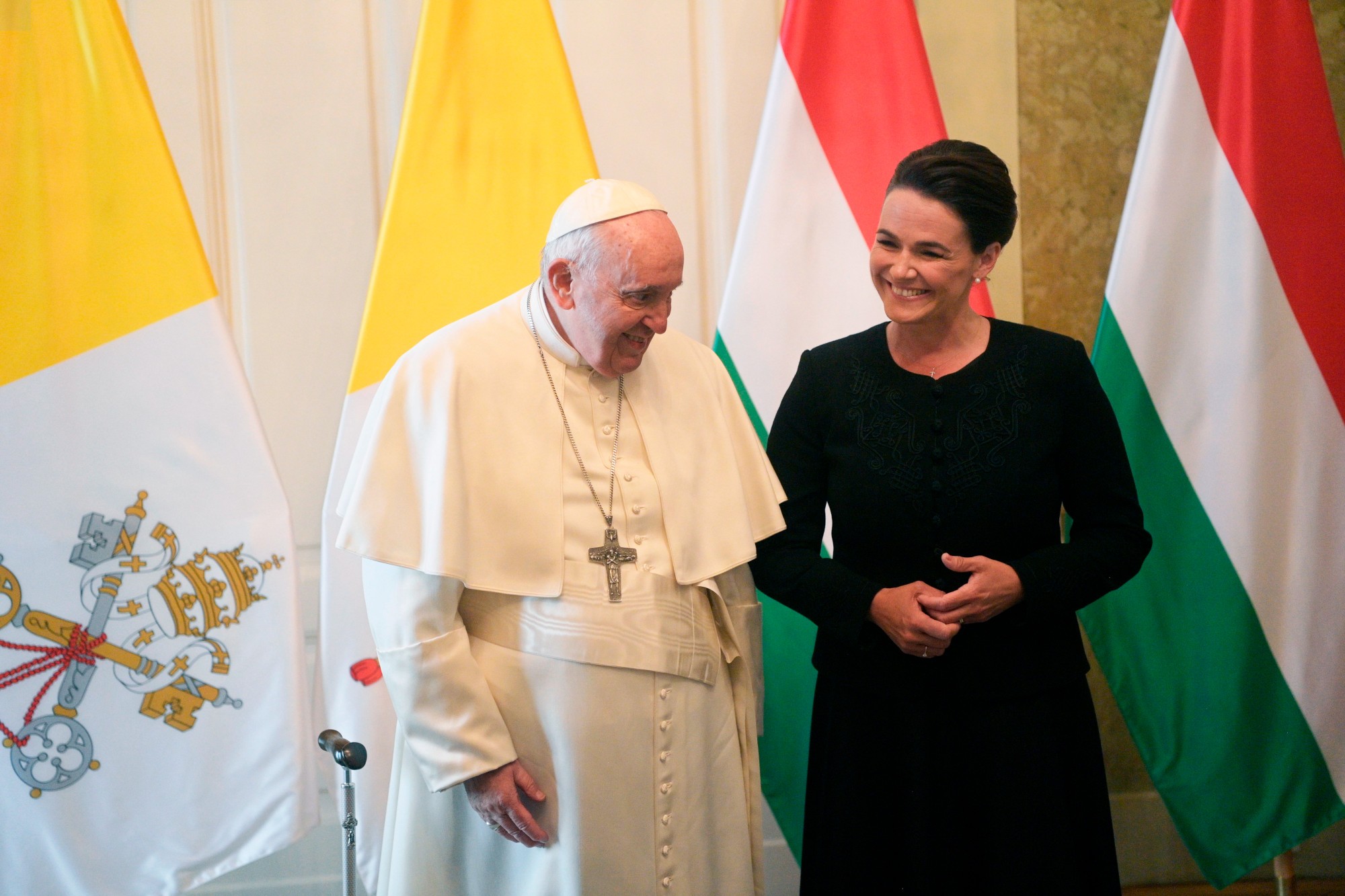 Novák Katalin köztársasági elnök fogadja Ferenc pápát a Sándor-palotában Fotók: MTI