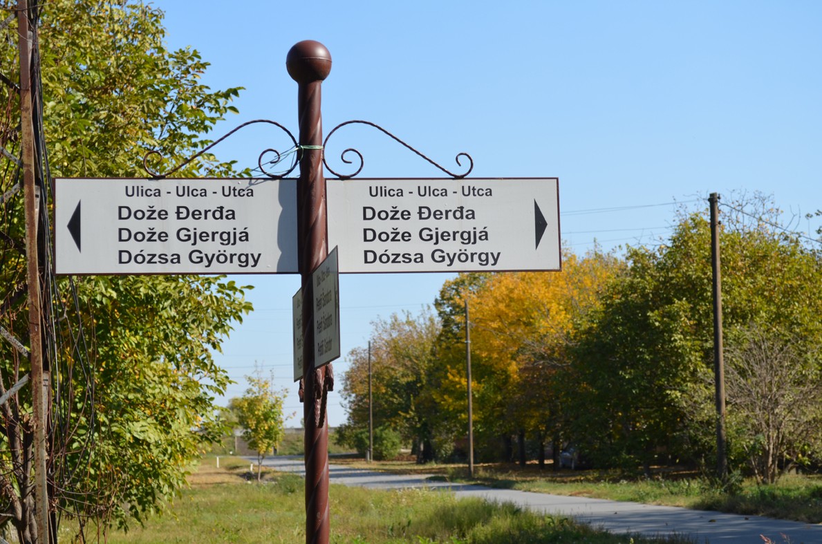 Jelenleg háromnyelvű, négyfeliratú tábla áll a falu bejáratánál. A cirill és a latin betűs szerb, valamint a bolgár Ivanovo mellett szép magyar betűkkel írja: Sándoregyháza. A szerb-bolgár-magyar háromnyelvűséget az utcanévtáblák és az eligazító táblák biztosítják. Például: Pošta, Poštata, Posta. Vagy: Groblje, Grobuštata, Temető. De háromnyelvűek a Vajdasági, Petőfi Sándor, Proletár és egyéb utcák. Miközben a hirdetőtáblán a kukoricát már csak szerbül árulják: Na prodaju kuča u Ivanovo. A központban elhelyezett szocreál emlékmű oszlopának két oldalán szerb és magyar a felirat: A dicső és legyőzhetetlen Vörös Hadsereg elesett hőseinek tisztelet és hála jeléül Ivanovo lakossága.
