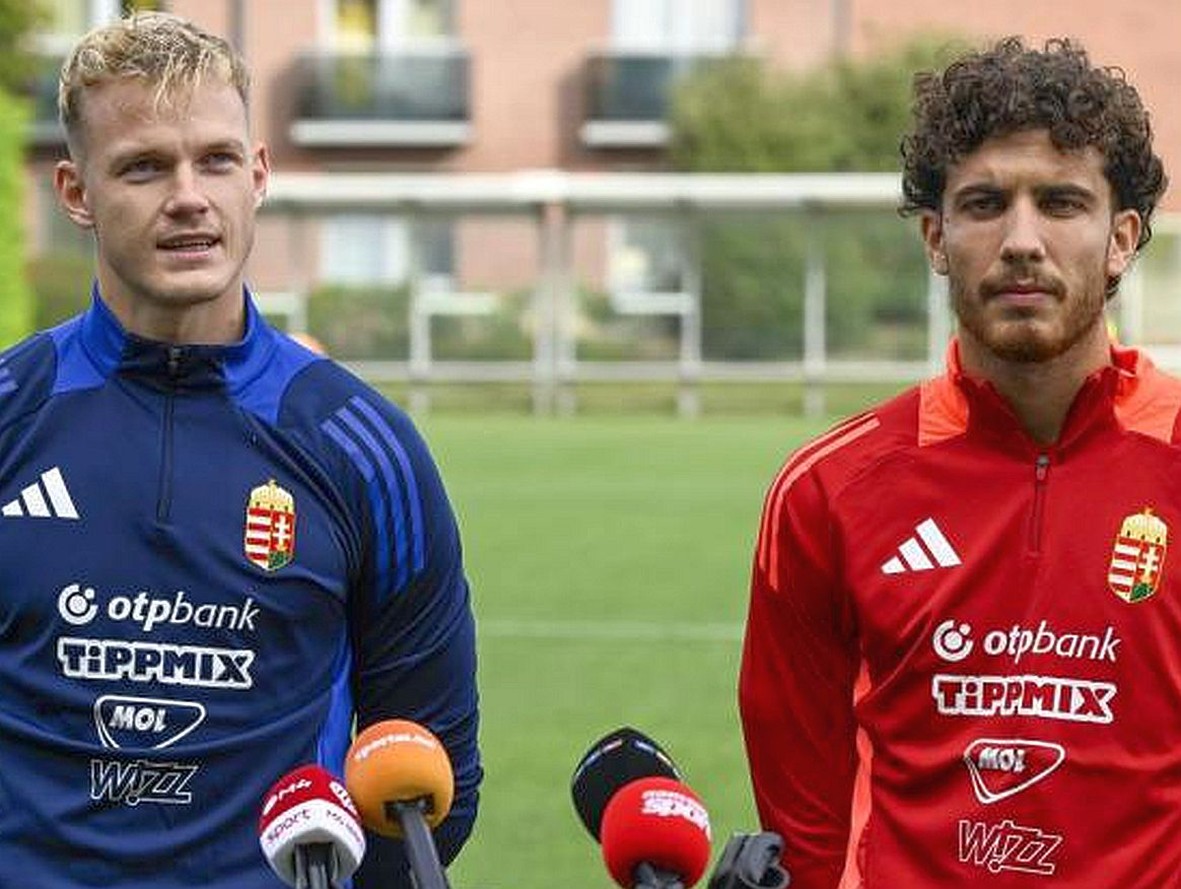 Tóth Balázs (b) és Balogh Botond a magyar labdarúgó-válogatott sajtótájékoztatóján az MLSZ Telki Edzőközpontjában 2025. október 7-én. Fotó: MTI/Purger Tamás