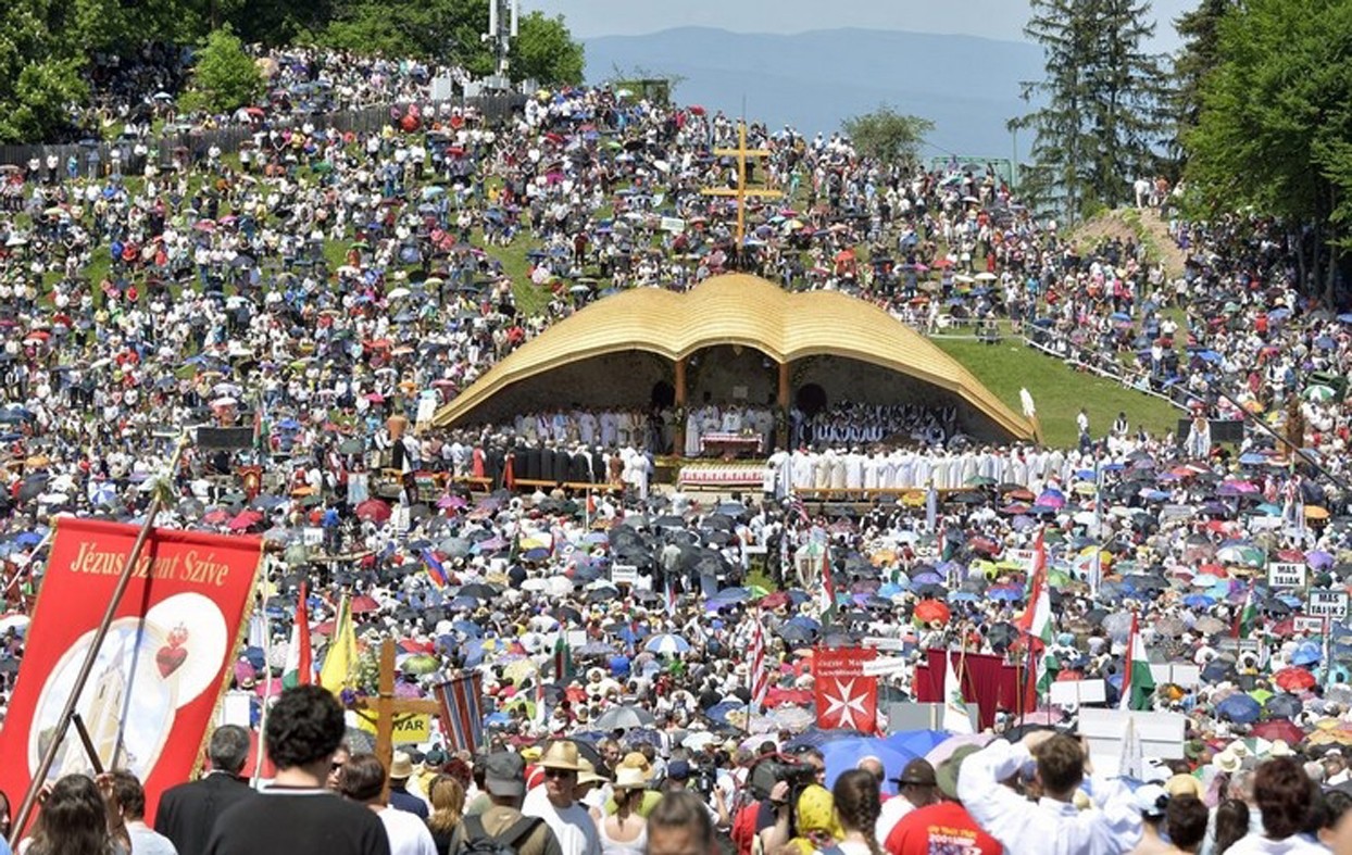 A pápai szentmisére kivetítőket is elhelyeztek a nyeregben, megoldották a hangosítást is. Tíz áldoztatópontot is létrehoztak.