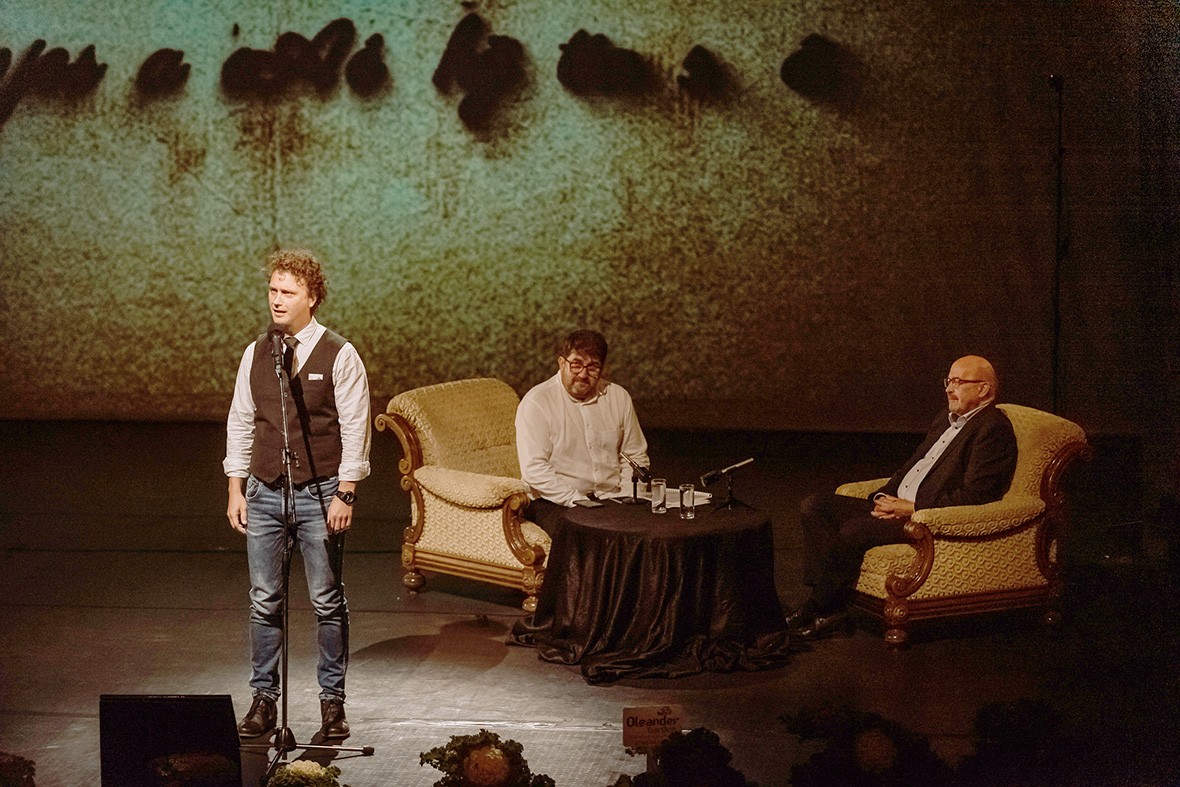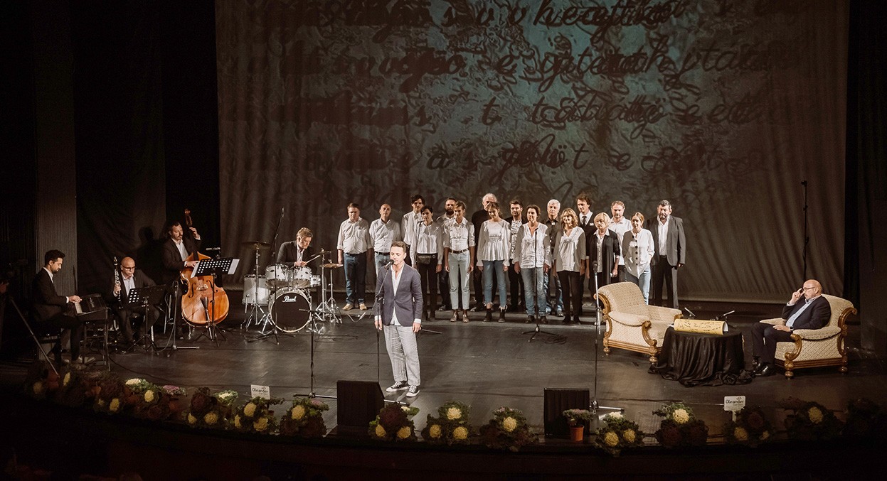 Két és fél óra vers szünet nélkül a nagyszínpadon? Merész vállalkozás a mai acsarkodó, rohanó, türelmetlen világban. Gáspárik Attila, a Hét város – Markó Béla 70 című versest rendezője, szövegválogatója, műsorvezetője hitt a csapatában és mindenekelőtt a költészet varázsában, jelesen a Markó lírájában, egyéniségében rejlő erőben, szuggesztivitásban. Jól tette. Élményteljes, kidolgozottságában is spontán, élő előadást köszönhettünk nekik szeptember 28-án. Olyat, amely torokszorító mozzanatokat éppúgy kínált, mint mosolyra, nevetésre késztető pillanatokat, önelemzést ösztönző döbbenetet éppúgy kiválthatott, mint nosztalgikus befelé fordulást. És ismét meggyőzött arról, hogy Markó Béla személyében nagy költőt köszönthetünk. Meg arról is, hogy a vers otthon van a Marosvásárhelyi Nemzeti Színházban, helye, becsülete van a Tompa Miklós Társulatnál. A színészek tudnak verset mondani, értelmezni, és merik saját egyéniségükhöz igazítani a költői üzenetet. A vers ettől csak nyerhet, s maga a szerző is rácsodálkozhat, hogy olyan értelmezésekkel találkozhat hirtelen, amilyenekre talán nem is gondolt, amikor a sorait írta. A színpadon ülő Markó ezt a Gáspárik Attilával folytatott eleven, hangulatos, őszinte beszélgetés folyamán be is vallotta, de anélkül is nyilvánvaló volt, ha a versmondások vagy a zenés momentumok alatt rá is figyeltünk. A költő nem öltött álarcot, nyitott volt minden kérdésre, nem jött zavarba, azt is megmondta, ha valamire már nem emlékezett. A kérdező Gáspárik ugyanis egész mélyre ásott, a több mint fél évszázada kibontakozott pálya feledésbe merült eseményeire is kitért. A hajdani Siculus fesztivál egyik olyan epizódjára emlékeztetett az elején, amelyen az ifjú Markó Béla dalszövegíróként kapott díjat egyik verséért. A múltidézésben segített a zeneszerző, kórusvezető Boros Csaba és a Kostyák Márton, Makkai István, Korpos András alkotta zenekar. Ők az éneklőkkel, a 22 tagú színészkarral is jól egymásra hangolódtak. Hatásosan, harmonikusan működött a szöveg-zene-látvány hármasa. De a versest fő mozgatója mégiscsak a költeményekkel illusztrált vallomásos párbeszéd volt. Napjainkig sorjáztak a kérdések, a költő számára fontos hét város – Kézdivásárhely, Kolozsvár, Marosvásárhely, Bukarest, Budapest, Brüsszel, Párizs – köré összpontosult a tematika, így kerekedett a költő életét, életművét, emberi arculatát színesen kirajzoló portrévá, személyes önvallomássá és részben közösségi számvetéssé, mindannyiunkat foglalkoztató, befolyásoló életérzések felmutatójává.