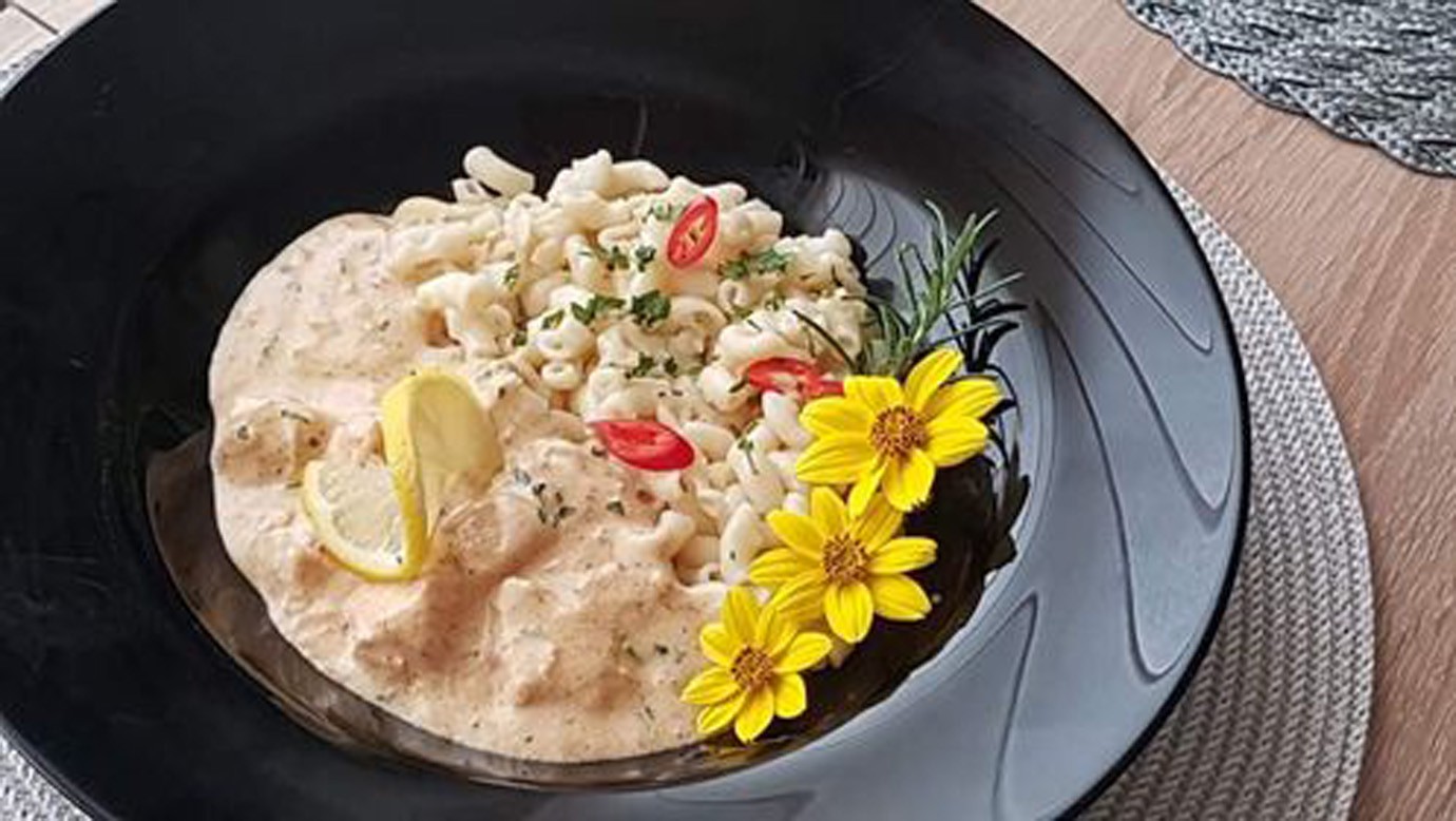 Egy kis fej hagymát apróra vágunk, és kevés olajon 2 cikk zúzott fokhagymával, pár kis kocka friss paprikával, 50 dkg csirkemellel (kockára vágva) átforgatunk, folytonosan kevergetve, amíg a hús fehéredni nem kezd. Sózzuk, borsozzuk, egy nagy citrom héját belereszeljük, és annyi vízzel töltjük fel, hogy éppen ellepje. Amikor a hús puha, 2 dl főzőtejszínnel besűrítjük. Kevés reszelt gyömbért, vagdalt citromfüvet és fél citrom levét a legvégén adunk hozzá. Laskával tálaljuk.