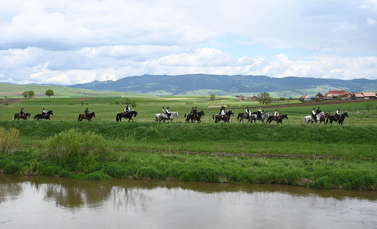 A csíksomlyói búcsúba tartó pünkösdi lovas zarándokok az Olt folyó partján, Csíkszentimre határában