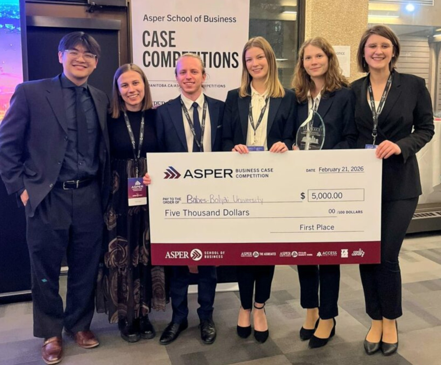 Jelentős nemzetközi sikert arattak a kolozsvári Babeș–Bolyai Tudományegyetem (BBTE) Közgazdaság- és Gazdálkodástudományi Karának magyar tagozatos mesterszakos hallgatói: a diákcsapat megnyerte a 2026-os Asper Business Case Competitiont, amelynek a kanadai University of Manitoba, Asper School of Business adott otthont. Az MBA- és mesterképzéses hallgatóknak szóló versenyre 2026. február 18–21. között került sor. A vetélkedőn a BBTE csapata hódította el az első díjat, megelőzve a dobogón két kanadai egyetem, a McMaster University és a HEC Montreal diákcsapatait.
