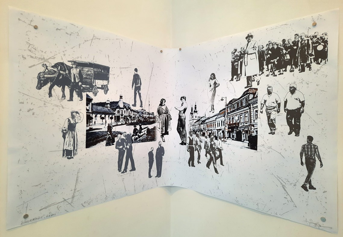 Több nyomaton találunk fényképet. Egyiken marosvásárhelyi fényképet – még a barátok egykori templomával és ma is látható tornyával, a járdán komolyan figyelő embe-rekkel – férfiak, lányok, gyermekek, a fotó mellett pedig tréfálkozó, esetleg ironizáló emberek, de a fotó előtt egy töprengő – Gondolkodó, mintha Rodinre utalna a grafikus – Mivé lettél, ó, édes városom?! Legmeglepőbb persze a nyúlfejű férfi – aki részese is, nem is az élcelődésnek. A fekete alakok az előtérben nyilván a mű valós idejét mutatják, a nyúlfejű férfi esetleg a virtuális valóságból érkezik. A fotón – a háttérben, az alapokat jelentve pedig a gazdag múlt. Ebben a megközelítésben azt találjuk, hogy különböző idők ütköznek egymással – az, ami komoly és kedves volt egykoron, mára ironizálhatóvá, esetleg nehezen érthetővé változott.