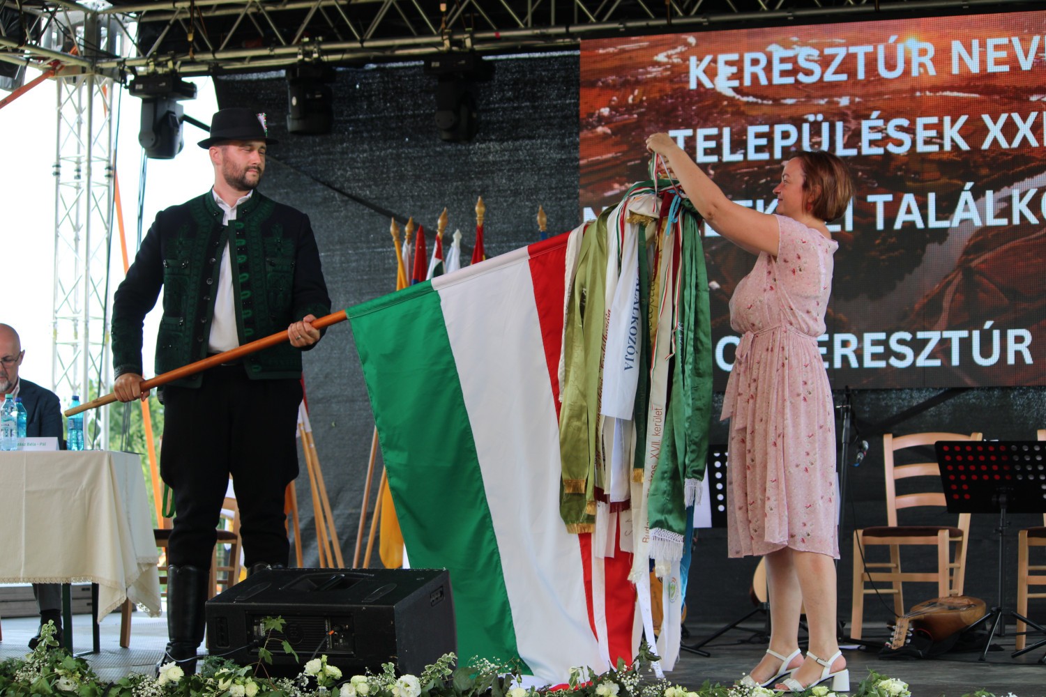 – Kedves keresztúriak, köszönöm nektek ezt a kihívást, mert csak így tudhattam meg, mennyire erős a név, mennyire nagy a szív, amely összeköt minden keresztúrit – zárta beszédét Kovács Edit, majd a Keresztúr nevű települések szövetségének vándorzászlajára felkötötte Maroskeresztúr szalagját.