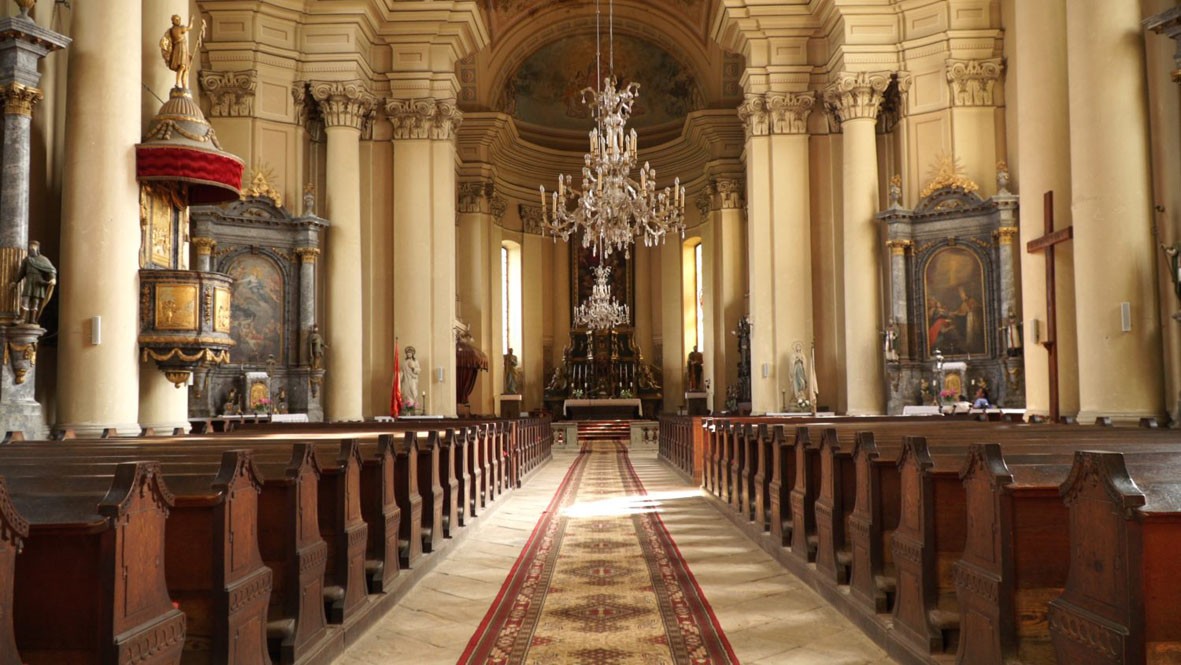 1748. szeptember 18-án saját erőből és csekély udvari támogatással elkezdték az egyhajós katedrális építését egy tiszafapark közepén. Szentélyében ugyancsak szeptember 18-án, 1759-ben mondták az első szentmisét. 1800-ban Szentháromság napján villám sújtotta a tornyot.