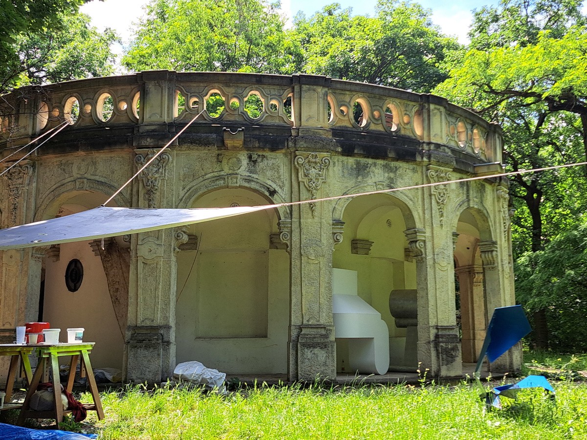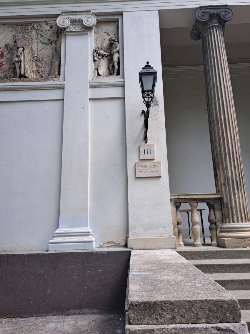 De alkotómunka, műteremtés, műtárgymentés is zajlott a javából. Stróbl ötlete nyomán került a kertbe egy XIII-XIV. századból származó műemlék, a budavári Mátyás-templom restaurálásakor eltávolított délkeleti kapuív. Ő készíttette el a Kolozsvári fivérek Sárkányölő Szent György-szobrának a mását is, ugyancsak Mátyás király bautzeni domborművének a másolatát. Ezek előtt is sokat időztünk a jelenlegi Epreskertben. És azt is megtudtuk, hogy az ő szorgalmazására kövenként szállították a kert közepére Józsefváros lebontásra ítélt, legendás XVIII. századi Kálváriáját. A műemlék épület belseje galériaként működik. Mindezek a sok szoborral, az installációkkal, más műalkotásokkal együtt olyan jelenkori szimbiózist teremtenek, ami jótékonyan pezsdítheti meg a művészeti hivatást választó egyetemi hallgatók fantáziáját. Ottjártunkkor diákokkal nem találkoztunk, de itt is, ott is szembeötlött a napi tevékenység, az alkotó erőfeszítések tárgyi bizonyítéka, valamilyen lenyomata.