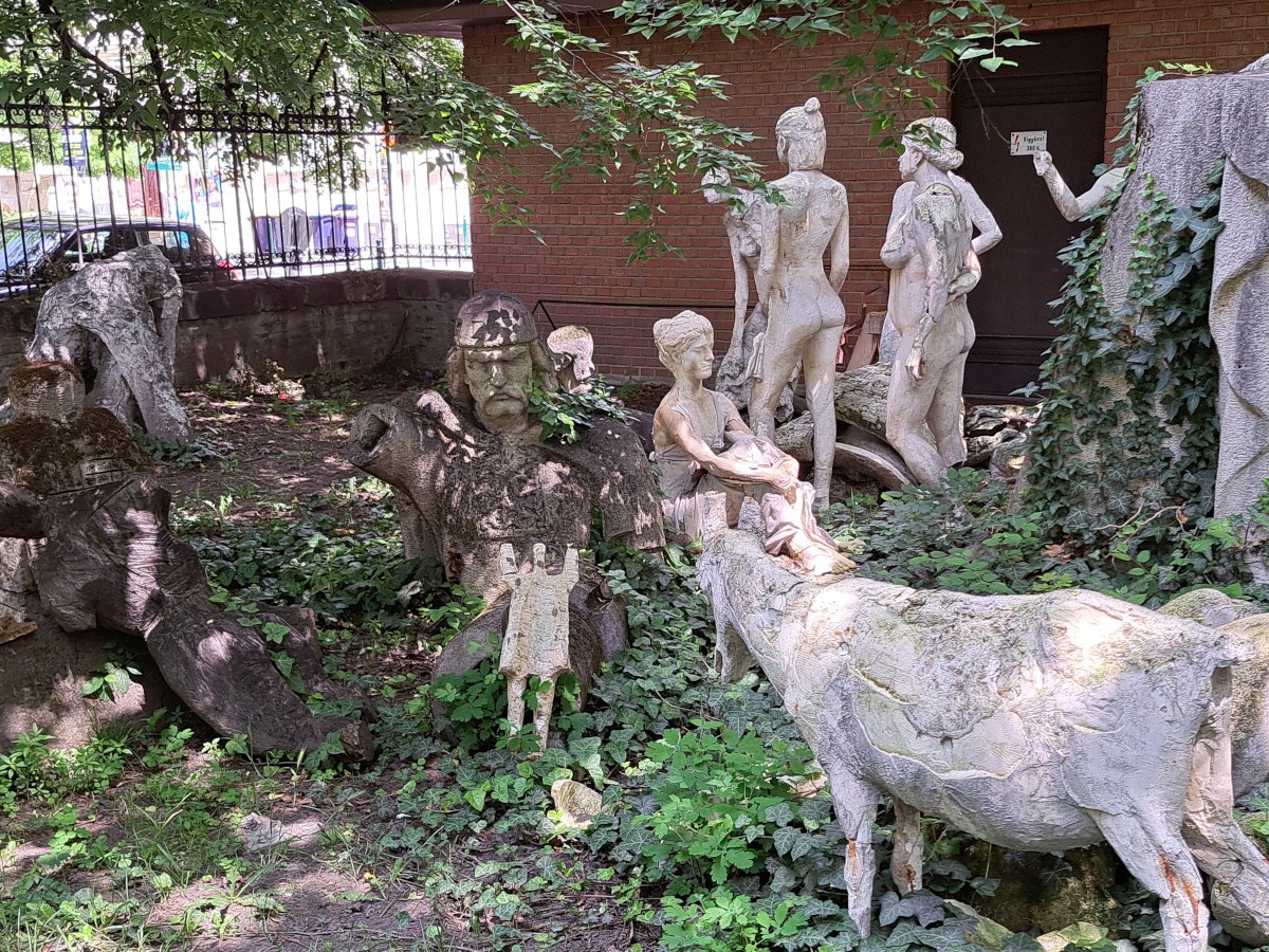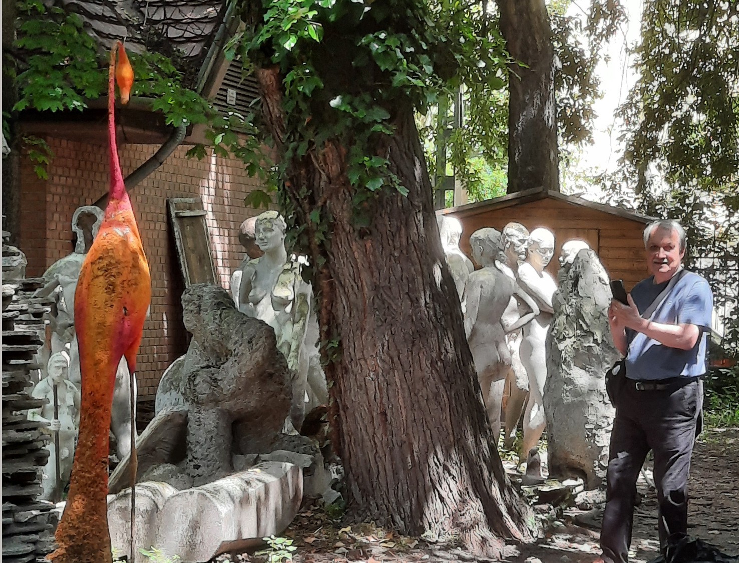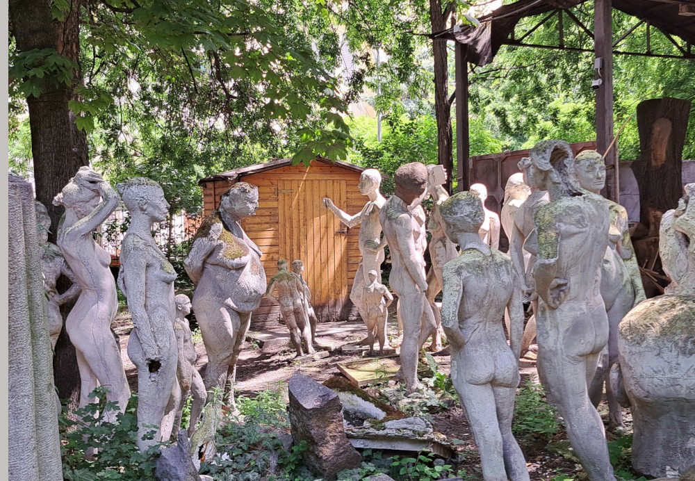 A késztetés, hogy belessen a vasrácsos kerítésen át a hatalmas lombok alatt összegyűlt fura szobornépességre, mindenkiben megvan, aki végigmegy a budapesti Szondi utcán, és észreveszi a dús növényzet között a titokzatos „idegeneket”. Férfiak, nők vegyesen, idősek, gyermekek, klasszikus aktok, szokatlan emberfigurák, torzók, formabontó, modern alakok vonják magukra a tekintetet a főváros közepén, az Epreskertben. Magam sokat kószálok Budapesten, valahányszor alkalmam van rá, de a Bajza, Szondi, Munkácsy és Kmety György utcák határolta „ősparkba” még sohasem jutottam el. Május végén fedeztem fel a különös látványt, persze, hogy közelebbről is meg akartam nézni, ellenállhatatlan az ilyen sejtelmes helyek vonzereje. De nem úgy megy az, hogy csak egyet gondolok! Az Epreskert nem nyilvános sétatér, de nem is apácazárda, bár itt-ott a szakralitás jegyeit is felmutatja, a Magyar Képzőművészeti Egyetem tartozéka, a festő, szobrász és látványtervező tanszékek itteni műtermeiben, a bronzöntő, fémmegmunkáló, kőfaragó, gipsz- és üvegmunkákra szakosodott műhelyekben folyamatos a munka, azt nem lehet megzavarni. A rendhagyó „dzsungel” és a múltidéző épületek, alkotóterek megtekintése, alaposabb körbejárása külön engedéllyel lehetséges. A jóváhagyást az egyetem képzőművész rektora, az erdélyi művészeti életet s mindenekelőtt a gyergyószárhegyi művésztelepet felkaroló Erőss István nyilván megadta, ennek köszönhetően élmény- és fotótáram jócskán gazdagodhatott. Ezeknek csak kis hányadát tudom egy újságnyi oldalon felmutatni. A képzeletet mindegyre felpiszkáló epreskerti hangulatot sem lehet igazából érzékeltetni, de így is érdemes belekóstolni.