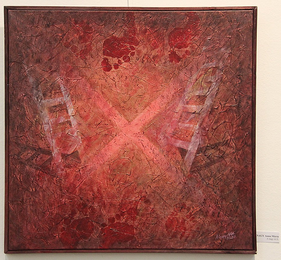 A Bernády Házban az üvegalkotások kínálta ragyogást, a műfaj egyik fontos jellegzetességét, a transzparenciát festményein mutatta fel a művésznő. Az ő színvilága is rendkívül megnyerő, geomterikusan elhelyezett, nagy zöld, piros felületei, más meleg tónusai, véletlenszerűnek vélhető, mégis tudatosan, ötletesen kialakított, mintázott faktúrái, az azokba rejtett sejtelmes jelképek ugyancsak belső utazást, önreflexiót sugallnak. Több kép címe – A nagy út, az Útkeresés – is erre utal. Mintha a Weöres Sándor-i figyelmeztetés is megfogalmazódna festői módra: a „bennünk a létra”. Akár gondolt rá a művésznő, akár nem, van, aki ezt is kiolvassa a festményből. Persze szeretnénk az üvegműveit is újra látni, de remélhetőleg erre is lesz majd alkalom. A mostani átállás biztos nem végleges, a festés viszont az alkotótáborokban is hozzáférhető. Nagy Anna Mária azokon is gyakori vendég.