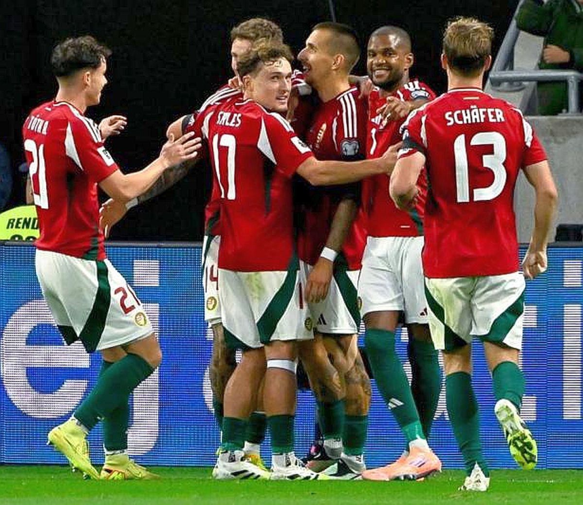 A magyar csapat gólöröme a Magyarország – Örményország labdarúgó-világbajnoki selejtező mérkőzésen a Puskás Arénában 2025. október 11-én. Középen a gólszerző Lukács Dániel Fotó: MTI/Purger Tamás