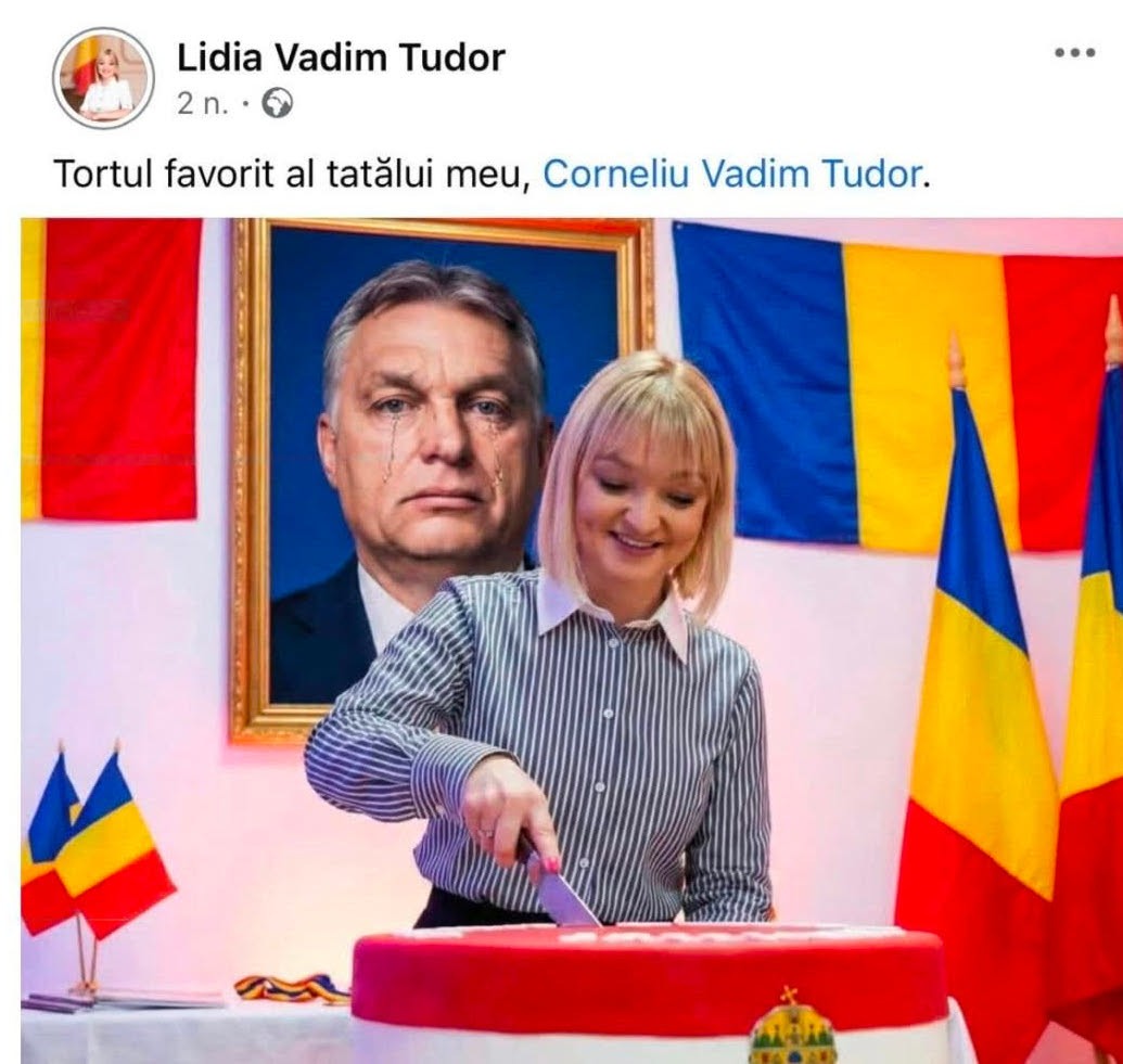 Az elmúlt napokban több, közösségi médiában terjedő, súlyosan provokatív és aggodalomra okot adó, mesterséges intelligenciával generált kép és videó látott napvilágot, amelyen Lidia Vadim Tudor román politikus, az AUR parlamenti képviselője egy Magyarországot szimbolizáló tortát vág fel. A háttérben egy síró Orbán Viktort ábrázoló kép látható, körülötte román zászlók. A szélsőséges politikus a bejegyzést közösségi oldalán „apja kedvenc tortájaként” kommentálta.